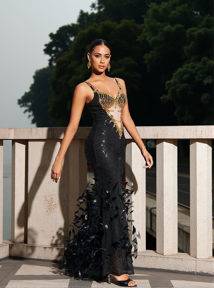 This Zane Cutout Rhinestone Feather Sequin Dress combines intricate cutout detailing, sparkling rhinestones, delicate feathers, and shimmering sequins for a statement-making look. With its elegant silhouette and high-quality material, it's perfect for any special occasion. Show off your unique style and turn heads in this stunning dress.