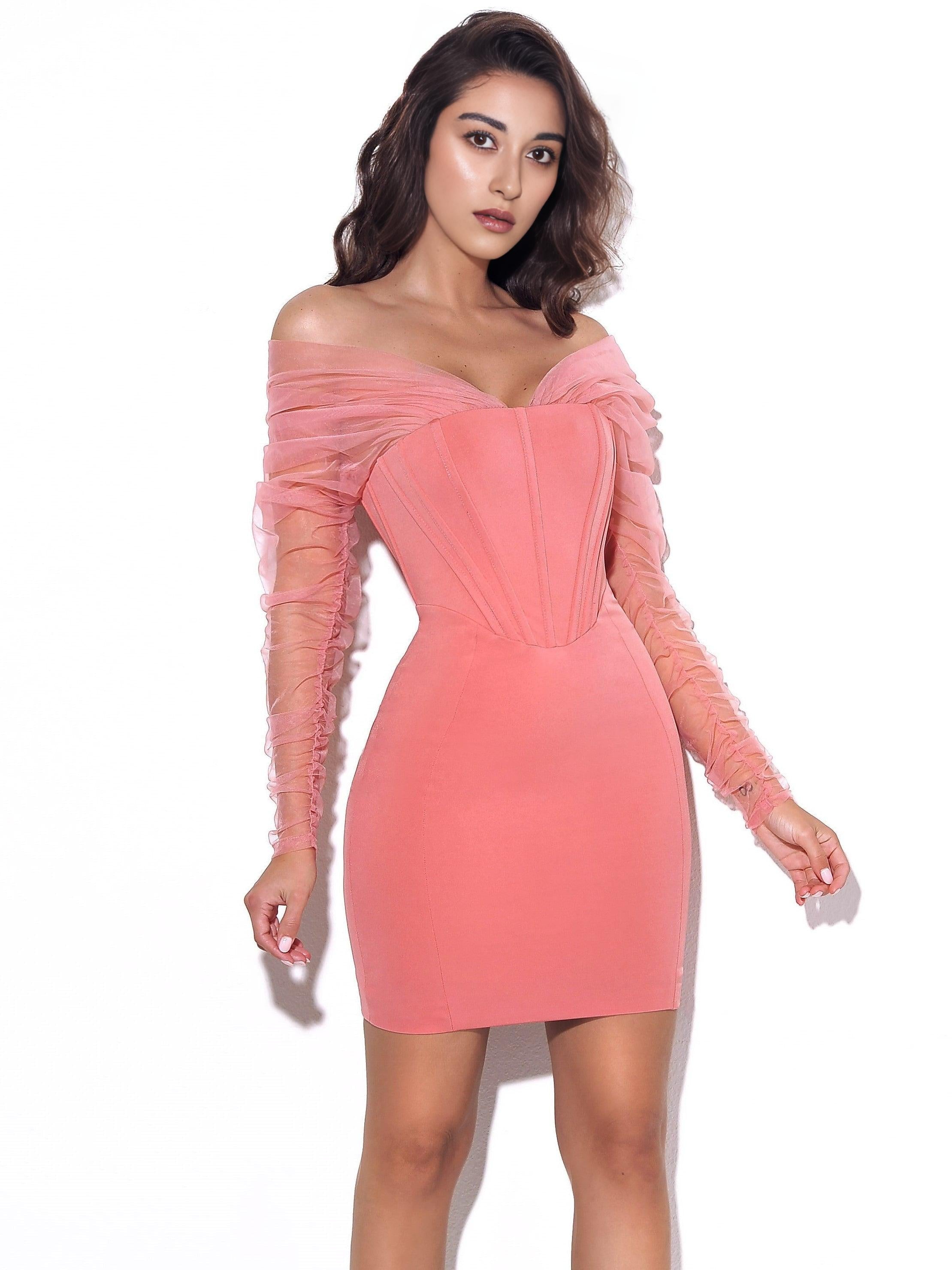 OFF SHOULDER MESH MINI DRESS IN PINK