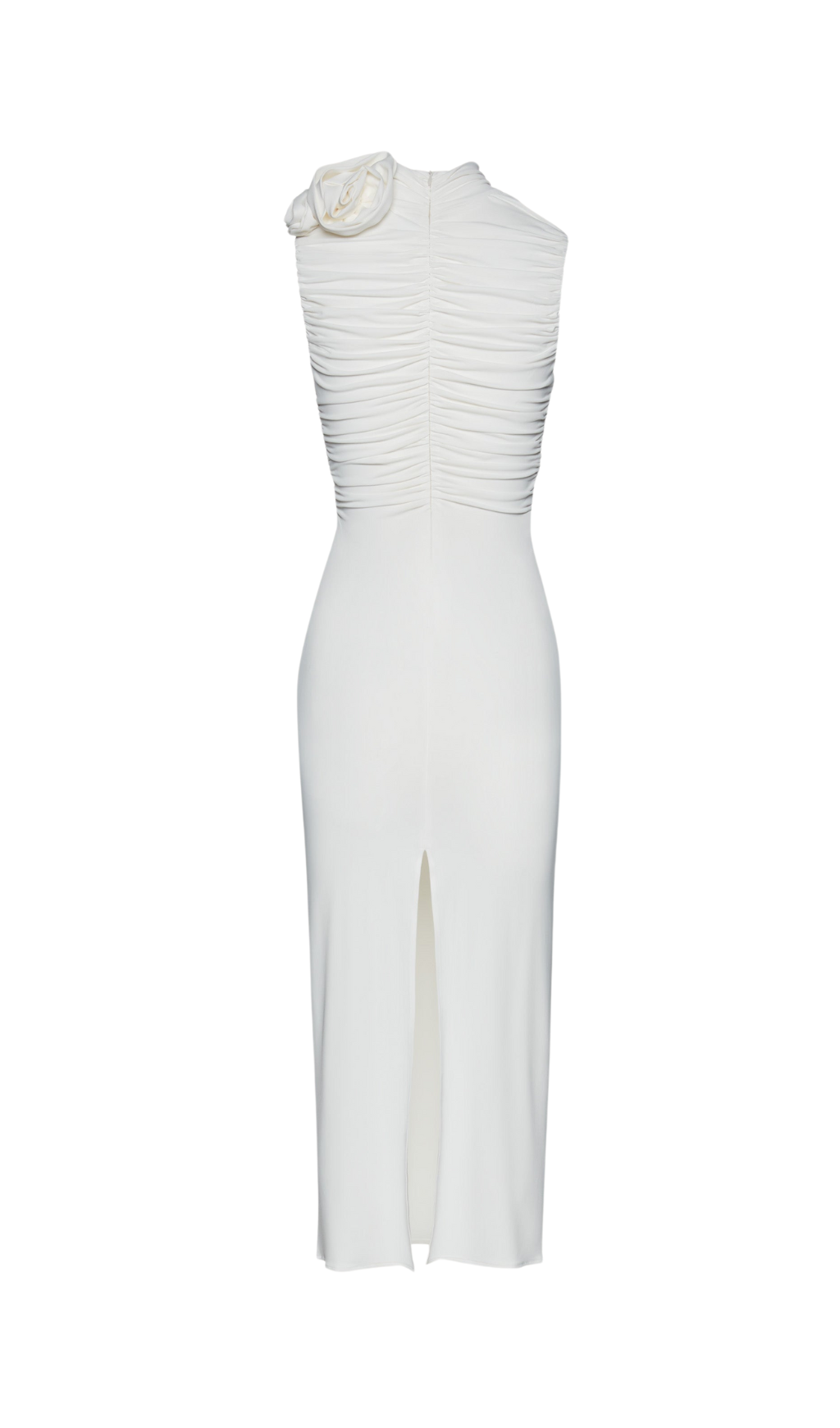 ADORA FLOWER EMBELLISHED RUCHED MIDI DRESS IN CREAM
