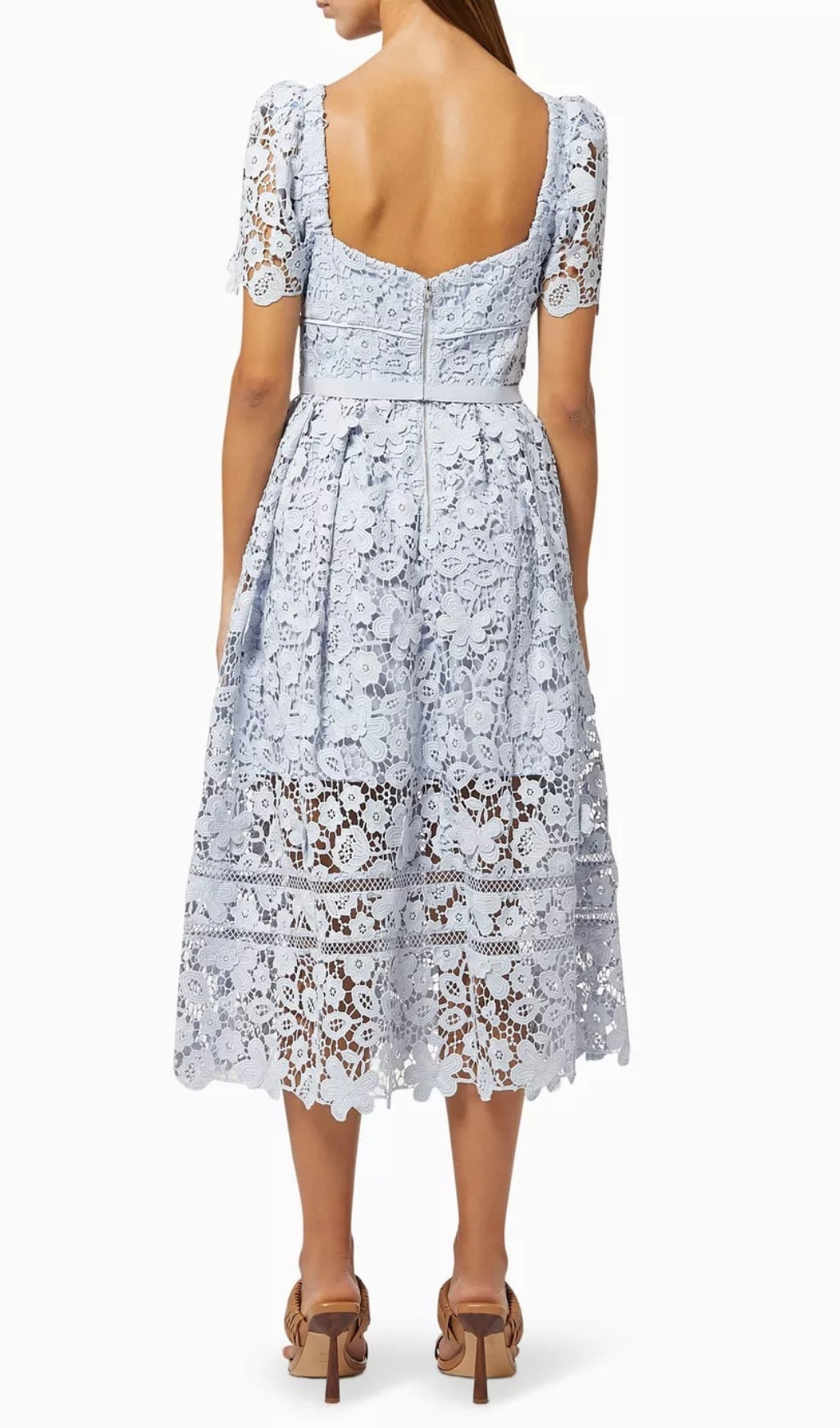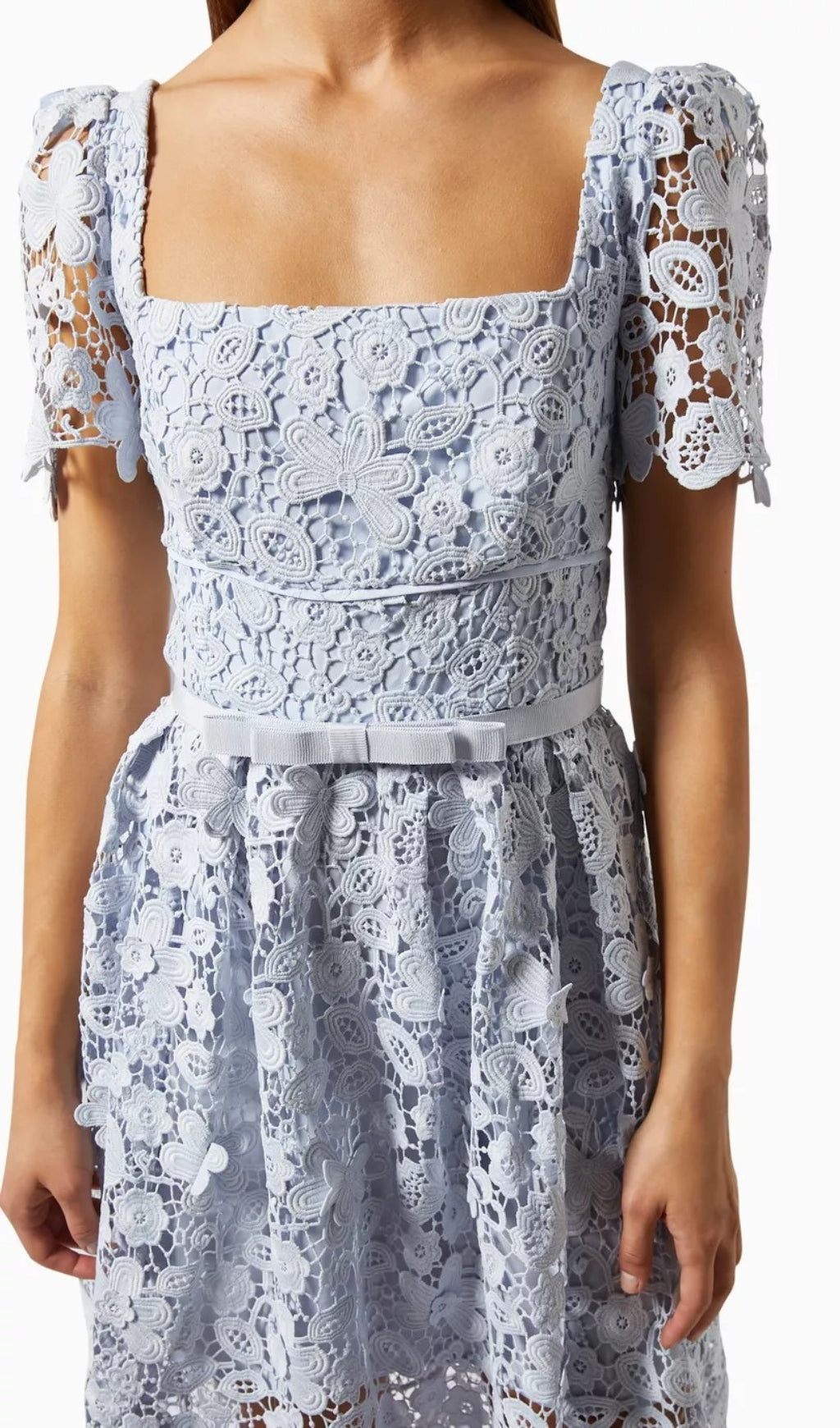 ANSELMA midi dress is overlaid with dreamy guipure lace, setting an elegant tone for summer events. Topped with a universally flattering square neckline, the dress is fitted with pretty puffed sleeves and cinches the waist with a detachable grosgain bow. Accessorise with a glossed lip and mini bag.