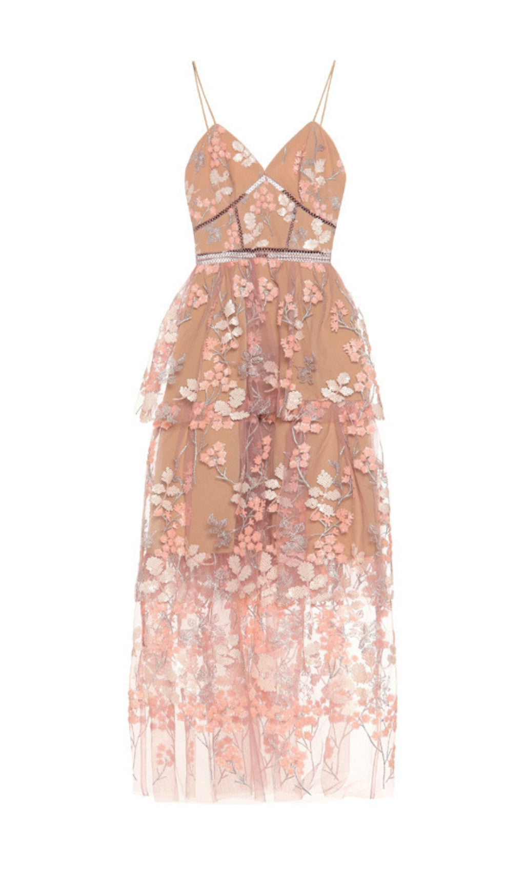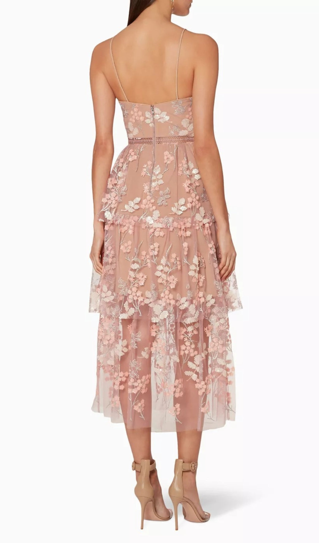 This ANTHEIA dress succinctly captures the brand’s romantic and exuberant vision. It suspends from thin straps, is detailed with tonal lace trims and cascades to a full tiered midi skirt. Save it for a special occasion, styled with nude stiletto heels.