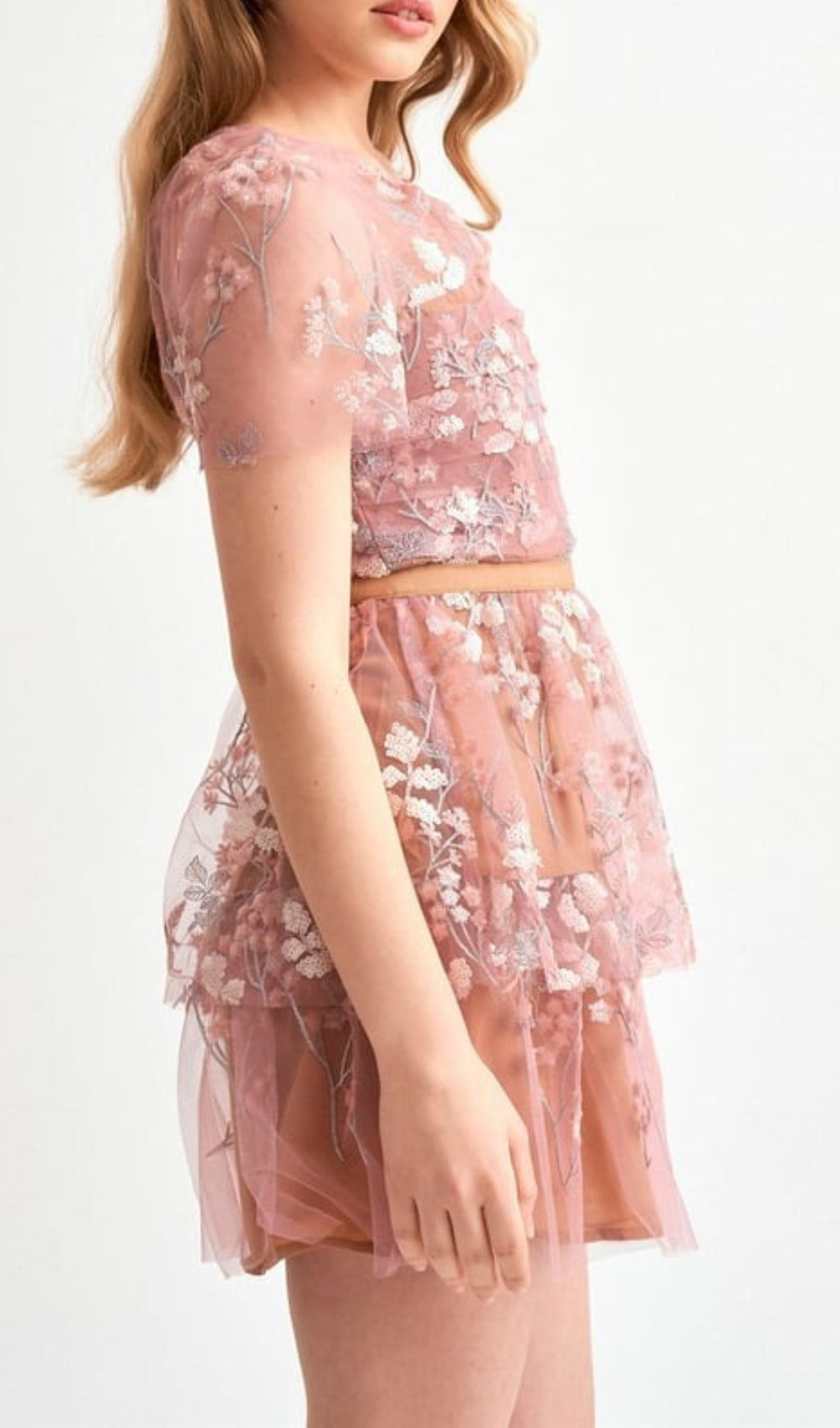 ANTIGONE FLOWER MESH TIERED MINI DRESS