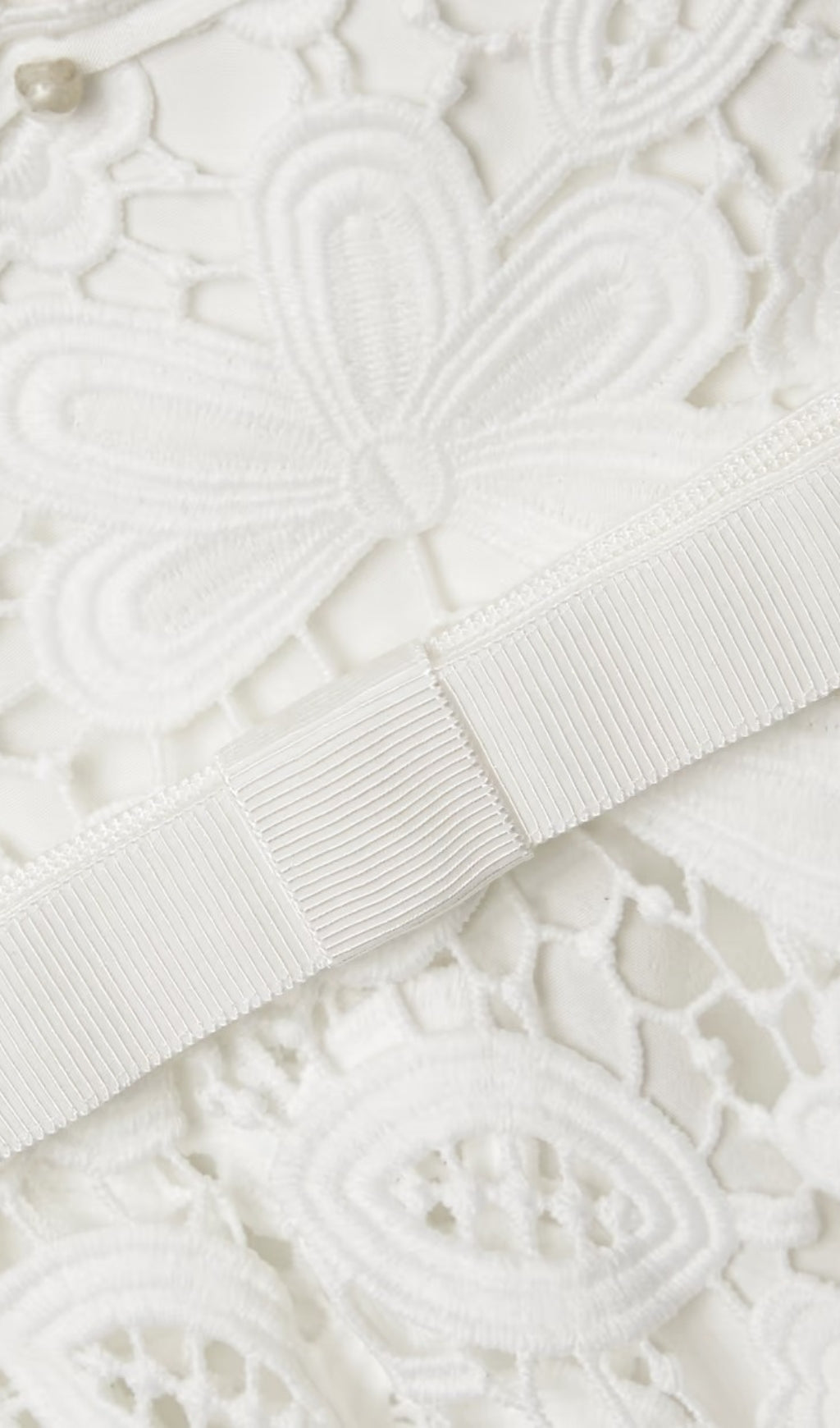Perfect for a micro ceremony in the city, this white mini dress is made from signature guipure lace and has a tonal grosgrain belt defining the waist. Wear it with minimalist heels and sapphire earrings