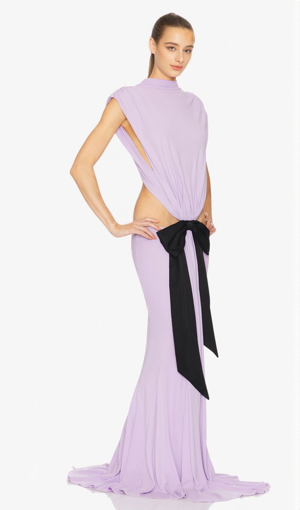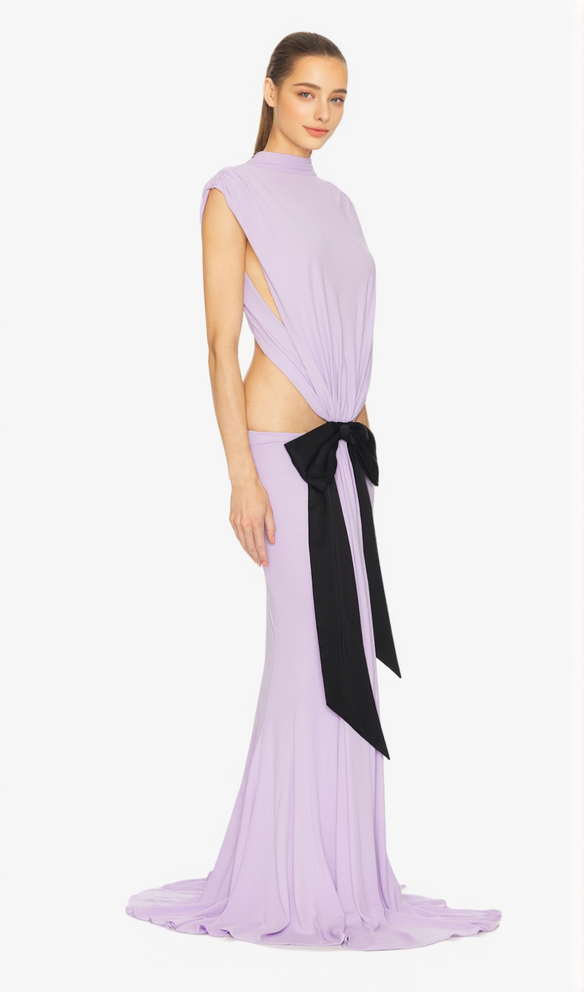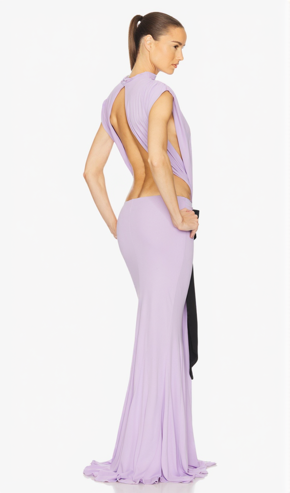 bernice Bow Patch Cut Backless Maxi Dress in purple