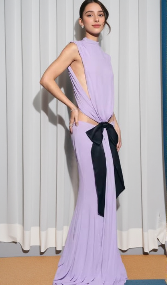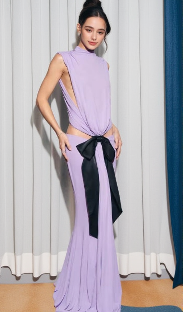 This elegant backless maxi dress in regal purple features a unique bow patch cut design. Expertly crafted with high-quality materials, this dress is perfect for making a statement at any formal event. Its flattering silhouette and eye-catching details will surely make you stand out.