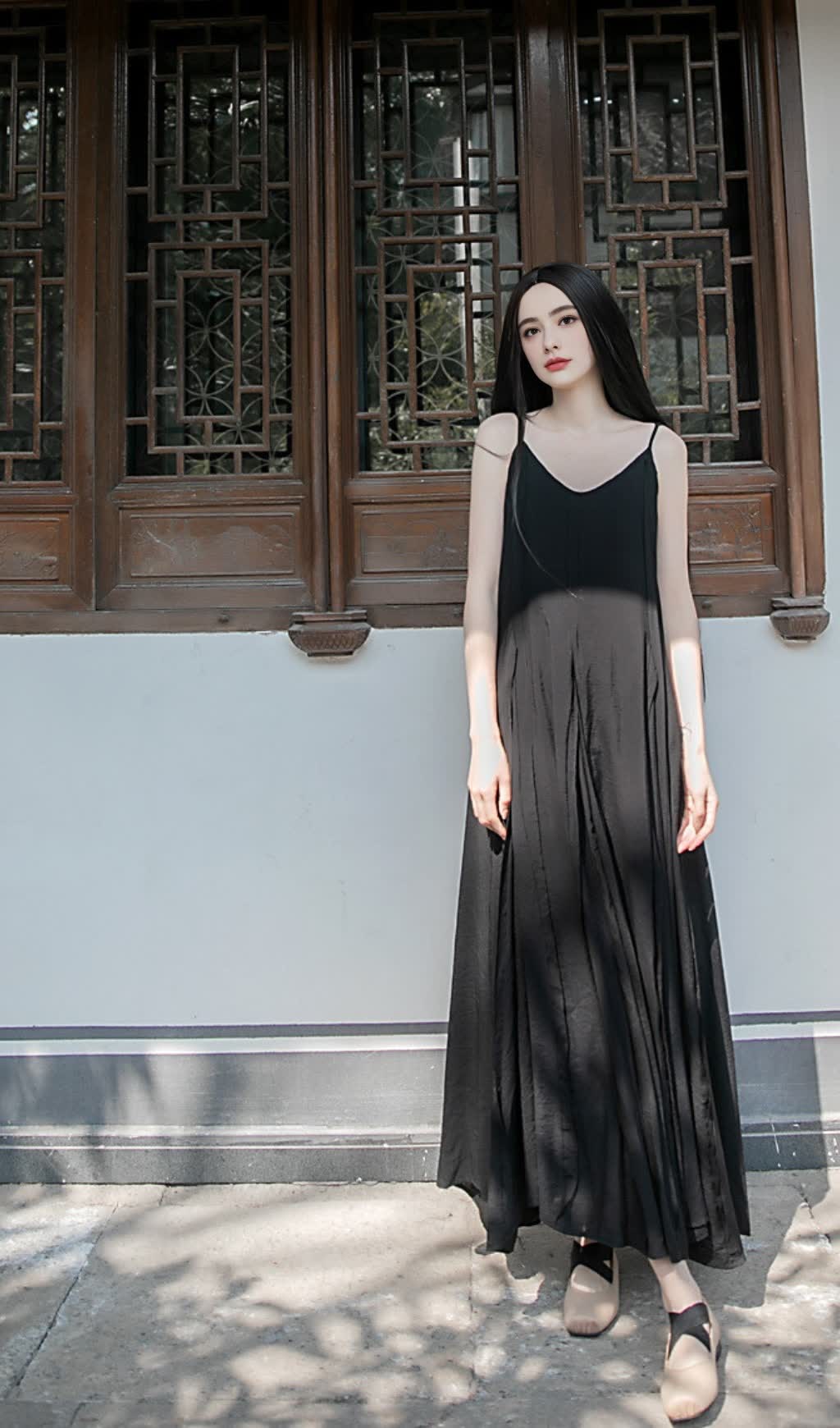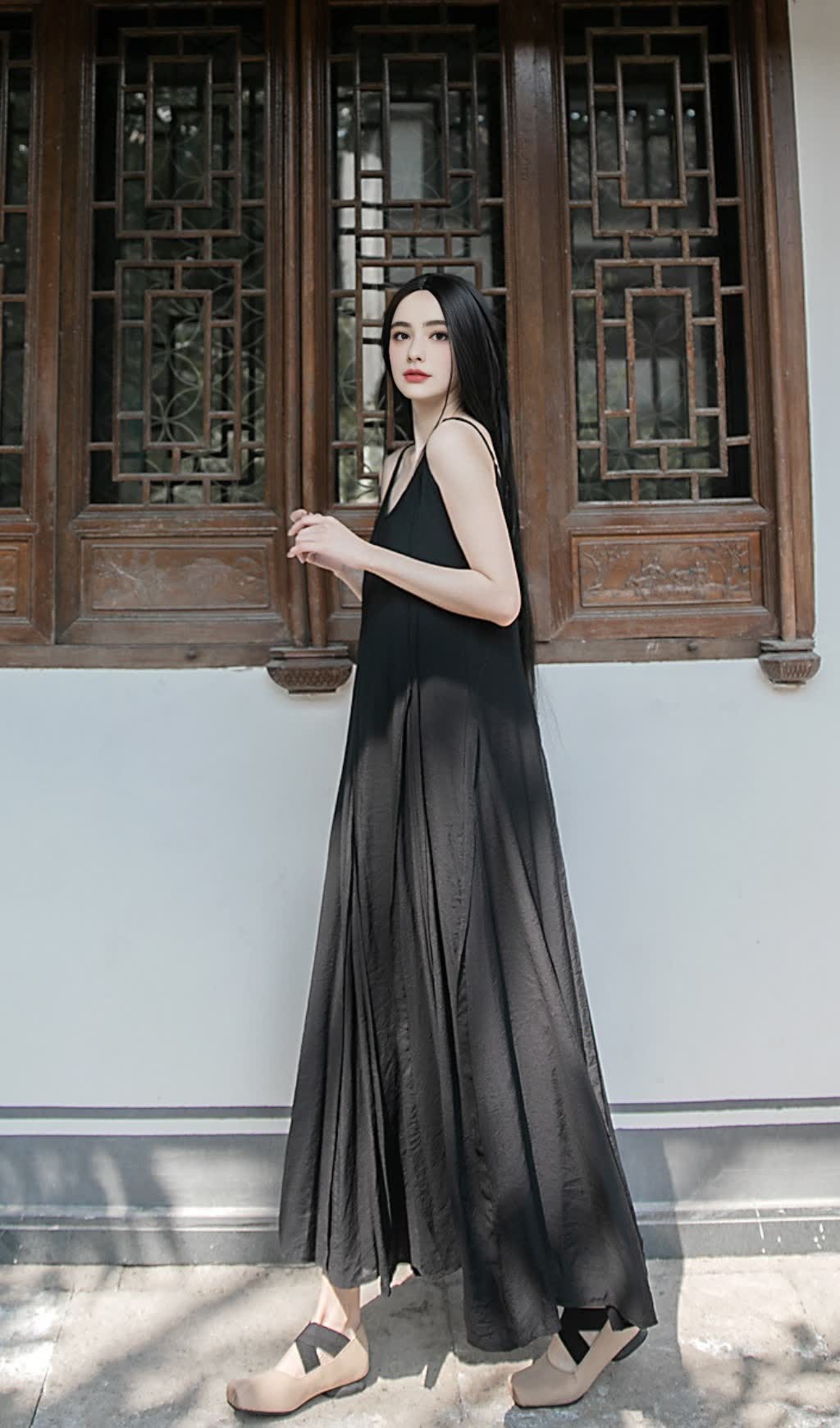 Scene: The background incorporates elements of Chinese - style architecture. The wooden carved windows are simple and elegant. The wall is in a light color, and the ground is a flagstone path. The light and shadow fall, and the whole creates a quiet environment full of oriental charm. The clothing integrates with the scene, highlighting a unique aesthetic.