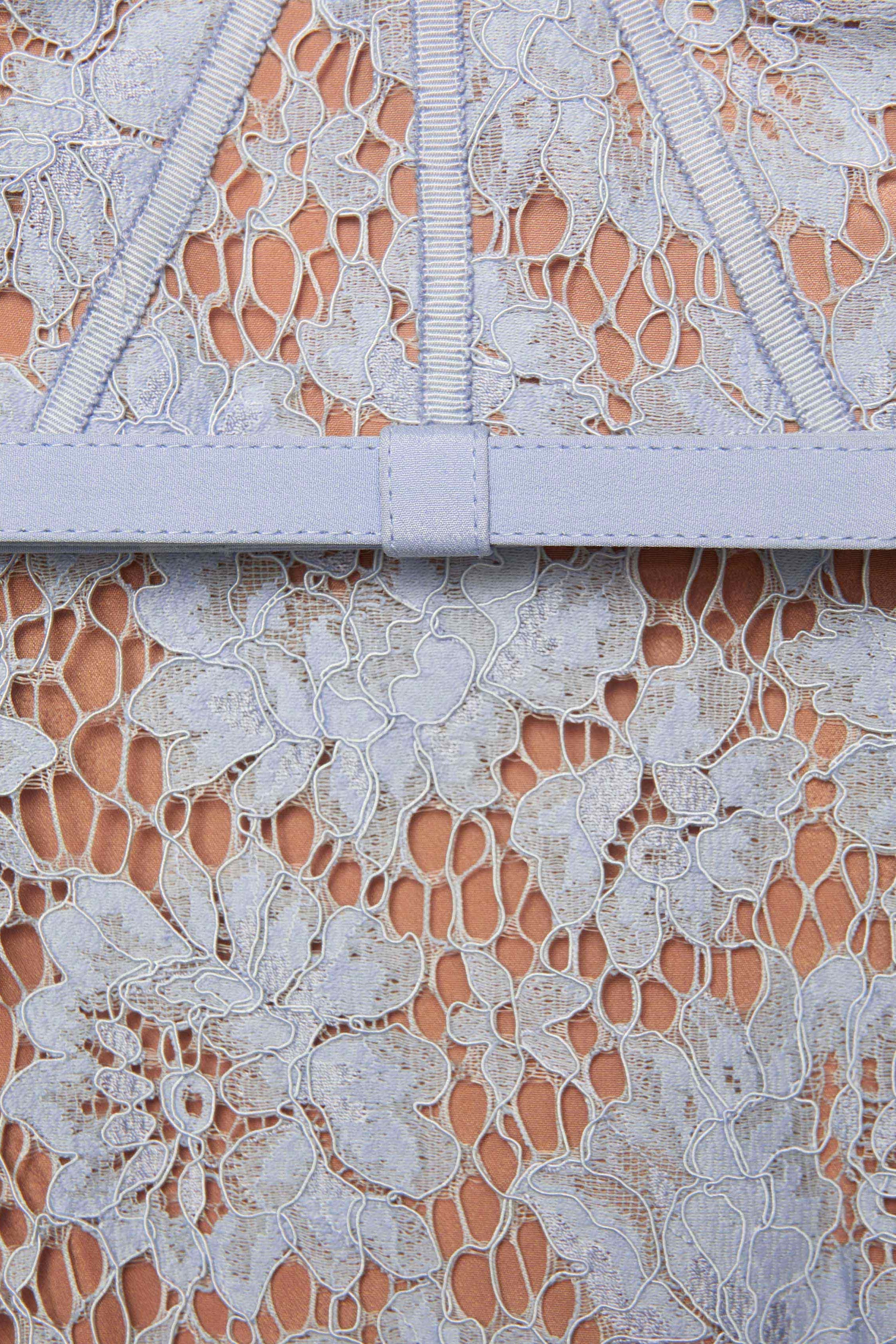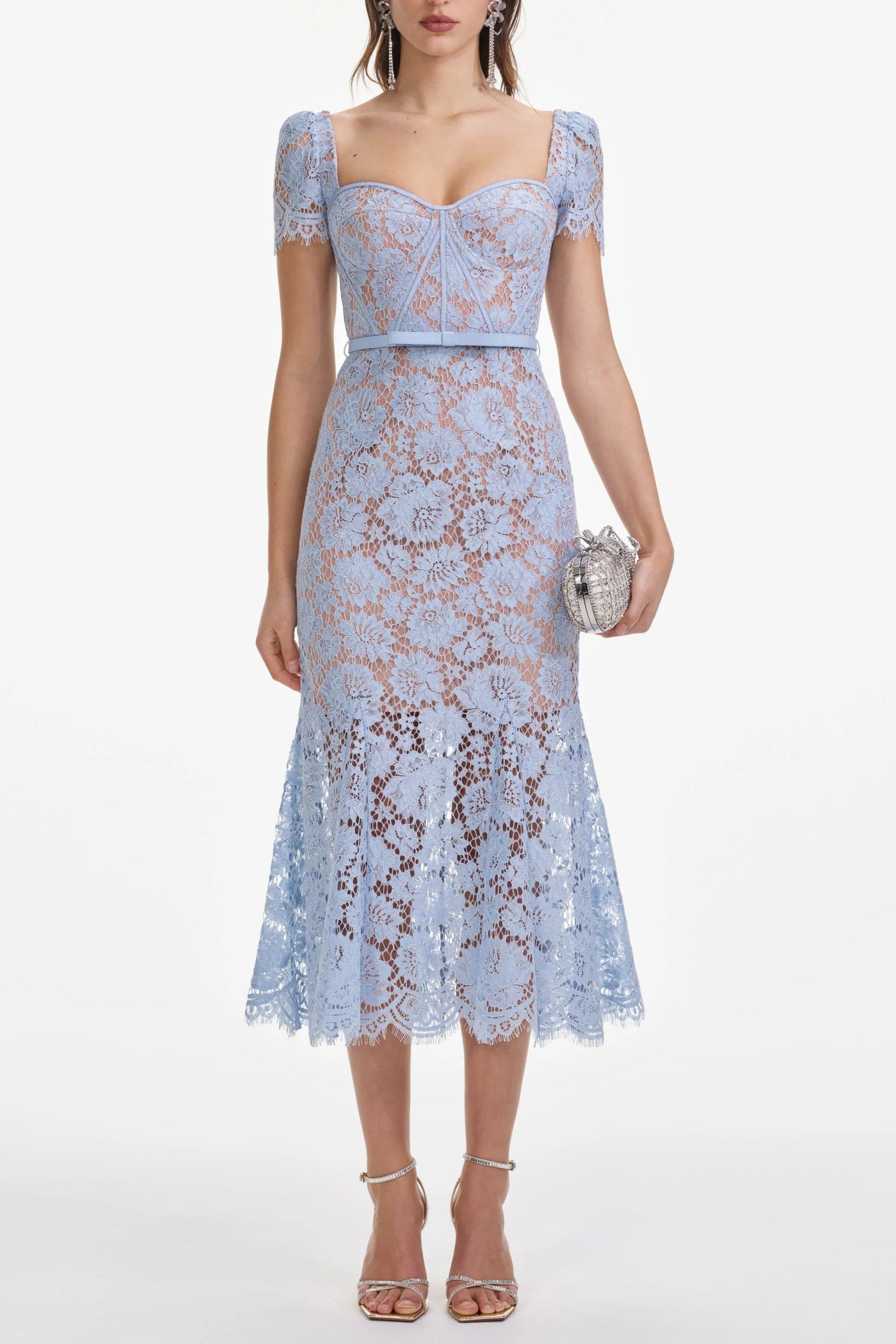 Unabashedly feminine in baby blue lace, this dress exudes elegant appeal. Accented with bust cup detailing and a bow motif belt – pair with statement heels for your next invite-only occasion.