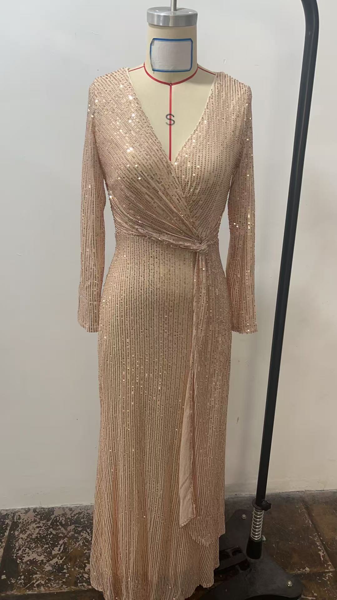 CHAMPAGEN SEQUINNED LONG - SLEEVED V - NECK MAXI DRESS