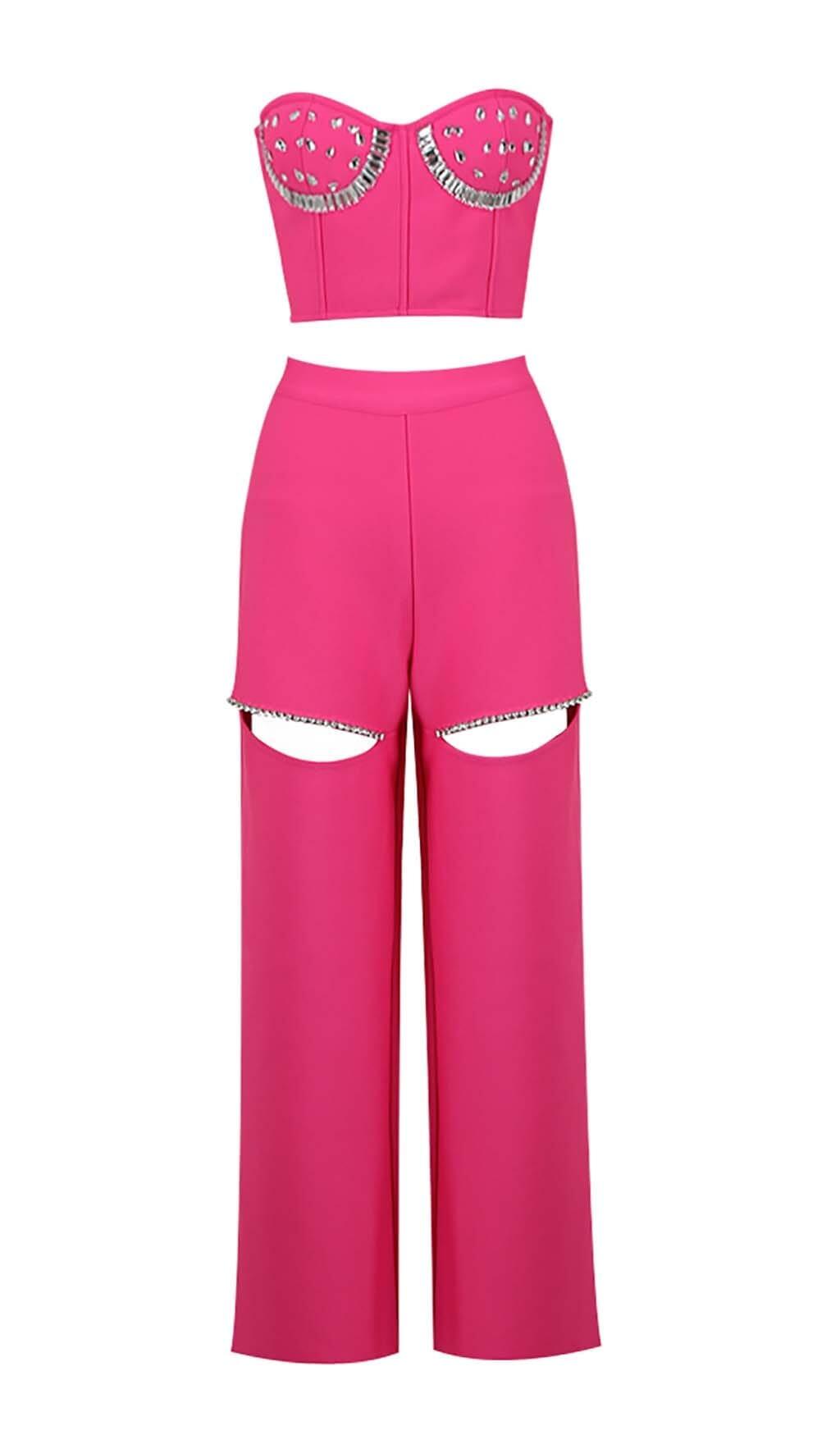 CRYSTAL STITCHED CUTOUT TWO PIECE SET IN PINK