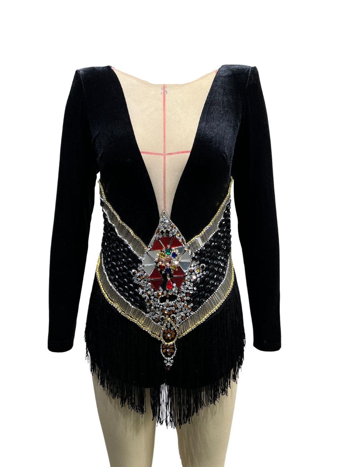 Step into luxury with our Decker Rhinestone Fringe Velvet Bodysuit. Made with soft velvet fabric, this bodysuit features rhinestone embellishments and delicate fringe detailing. Perfect for adding a touch of glamour to any outfit, this bodysuit is a must-have for any fashion-forward individual. Elevate your wardrobe today.