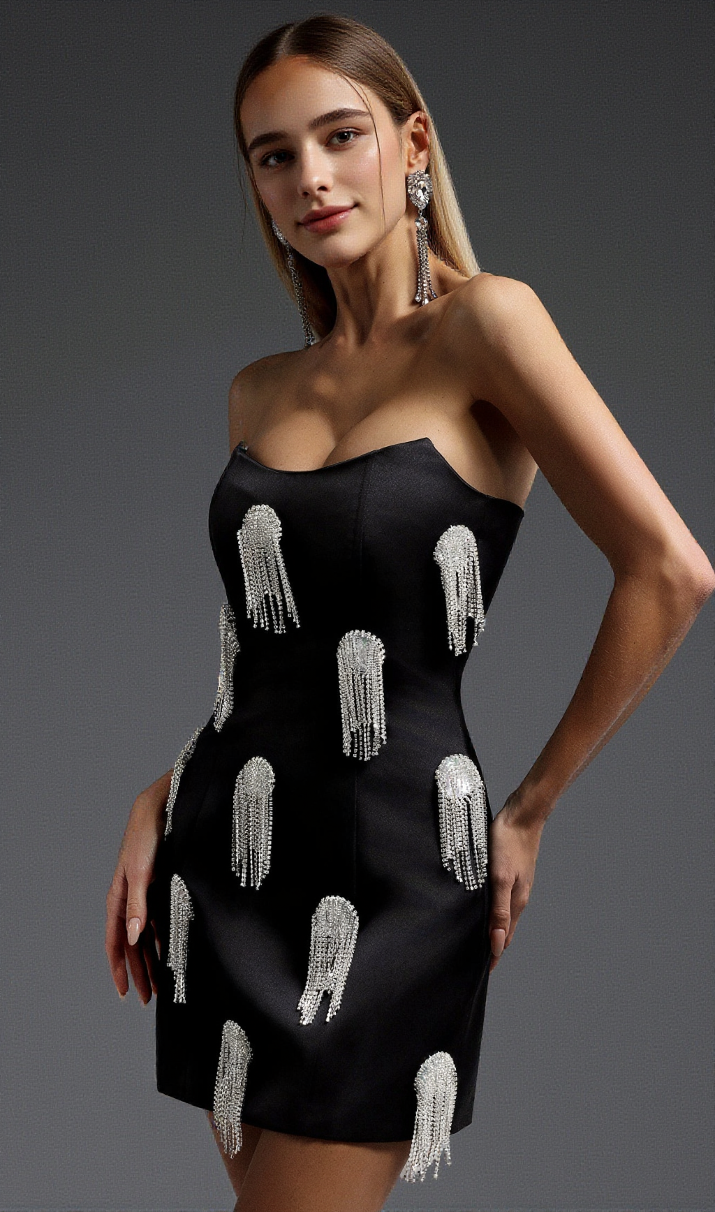As a product expert in fashion, I can confidently say that the Flor Sleeveless Diamond Tassels Mini Dress in black is a must-have for any wardrobe. Its sleek and elegant design, combined with the diamond tassels detail, adds a touch of sophistication to any occasion. Made from high-quality materials, this dress is both comfortable and stylish, making it a perfect choice for any fashion-forward individual.