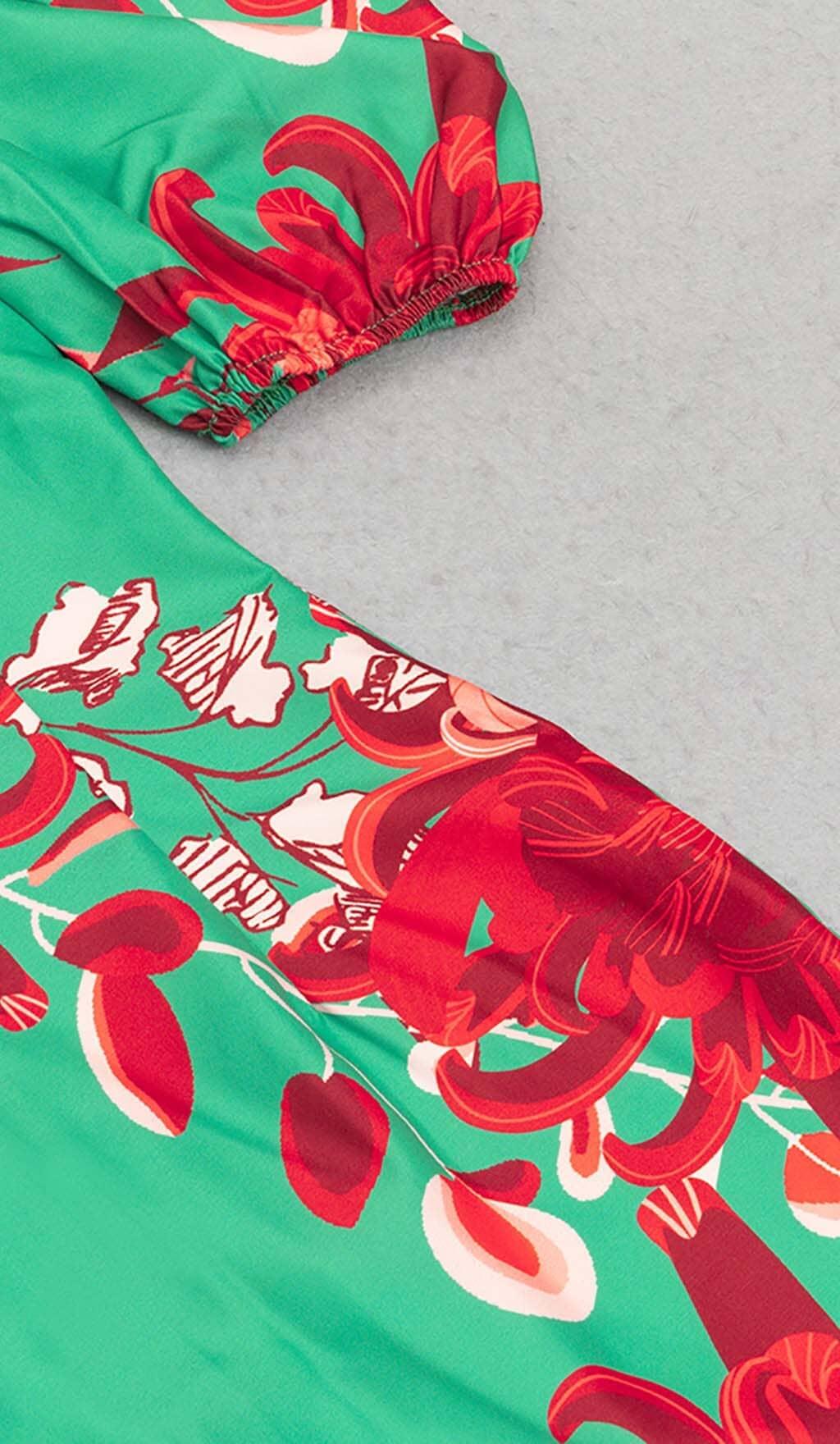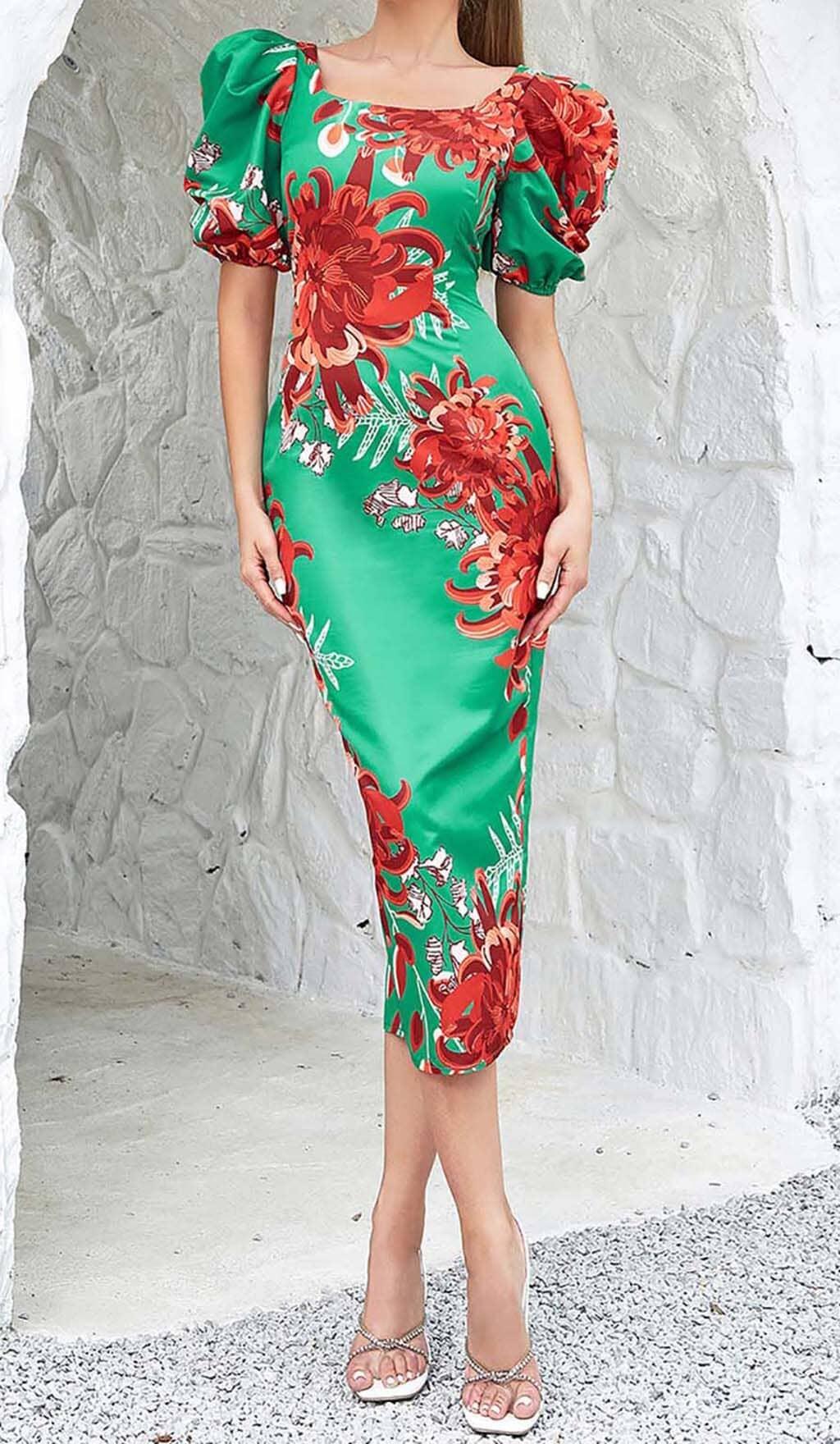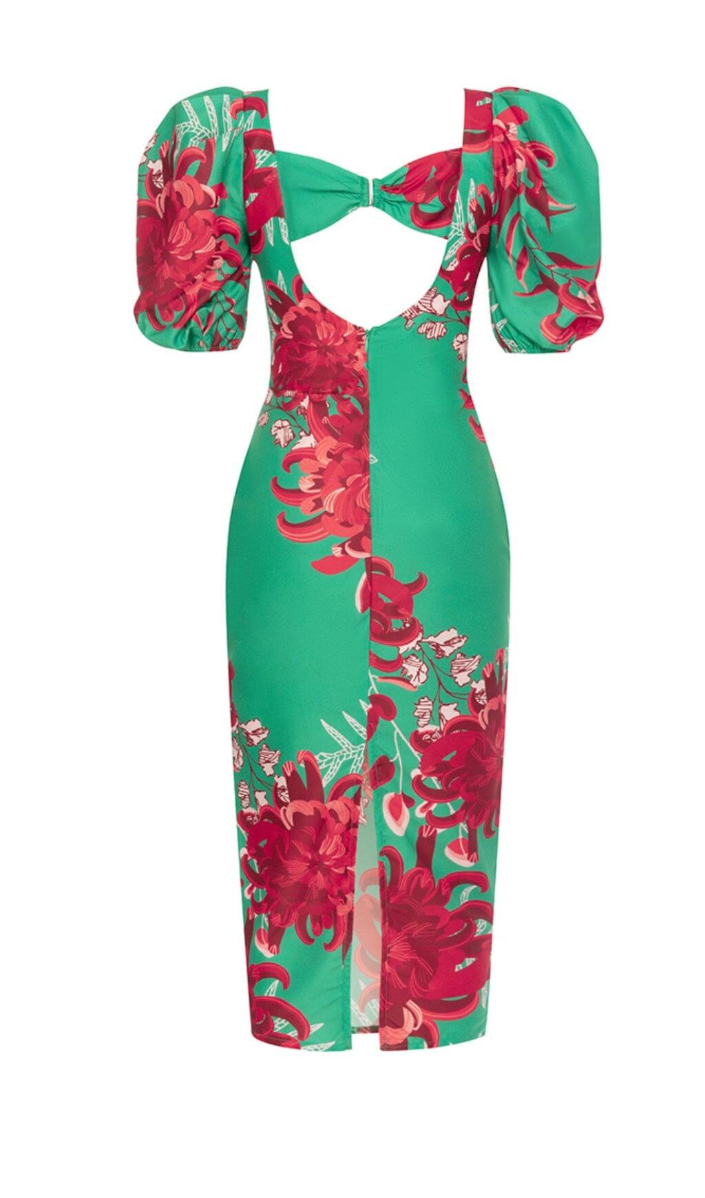 FLORAL PRINT PUFF SLEEVED OPEN BACK MIDI DRESS IN GREEN