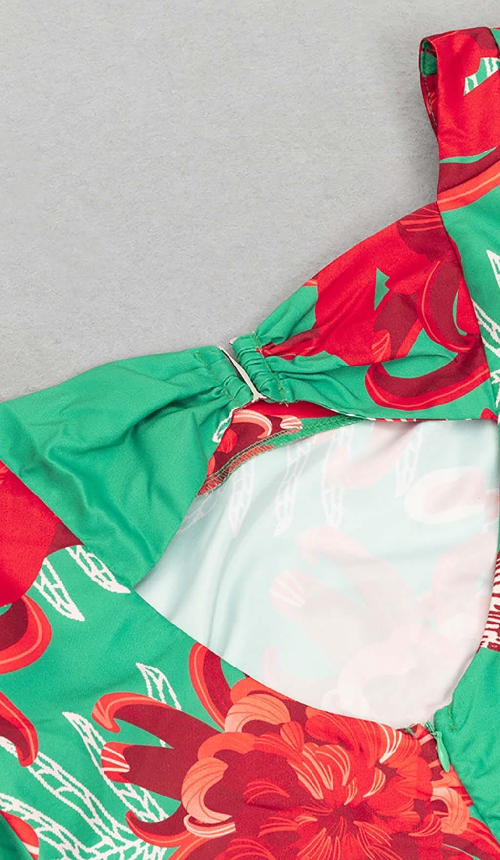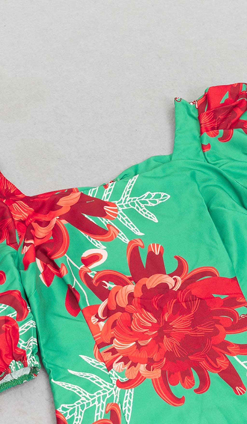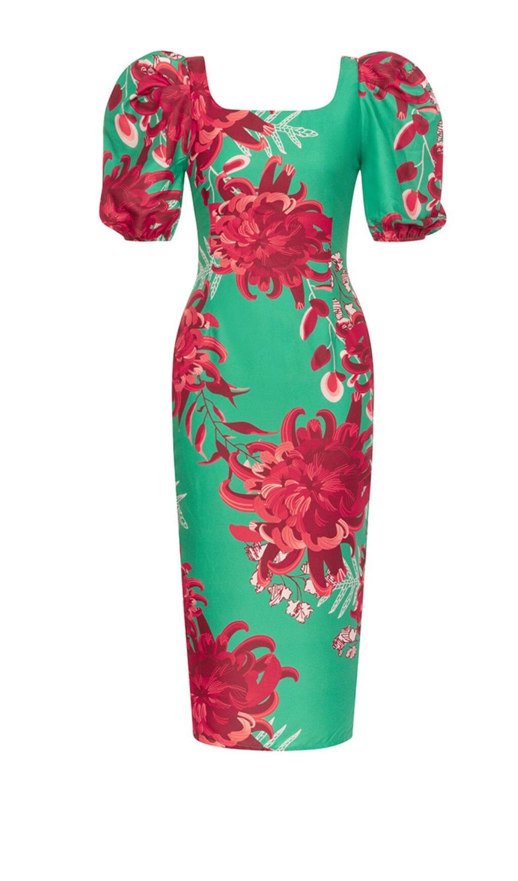 FLORAL PRINT PUFF SLEEVED OPEN BACK MIDI DRESS IN GREEN