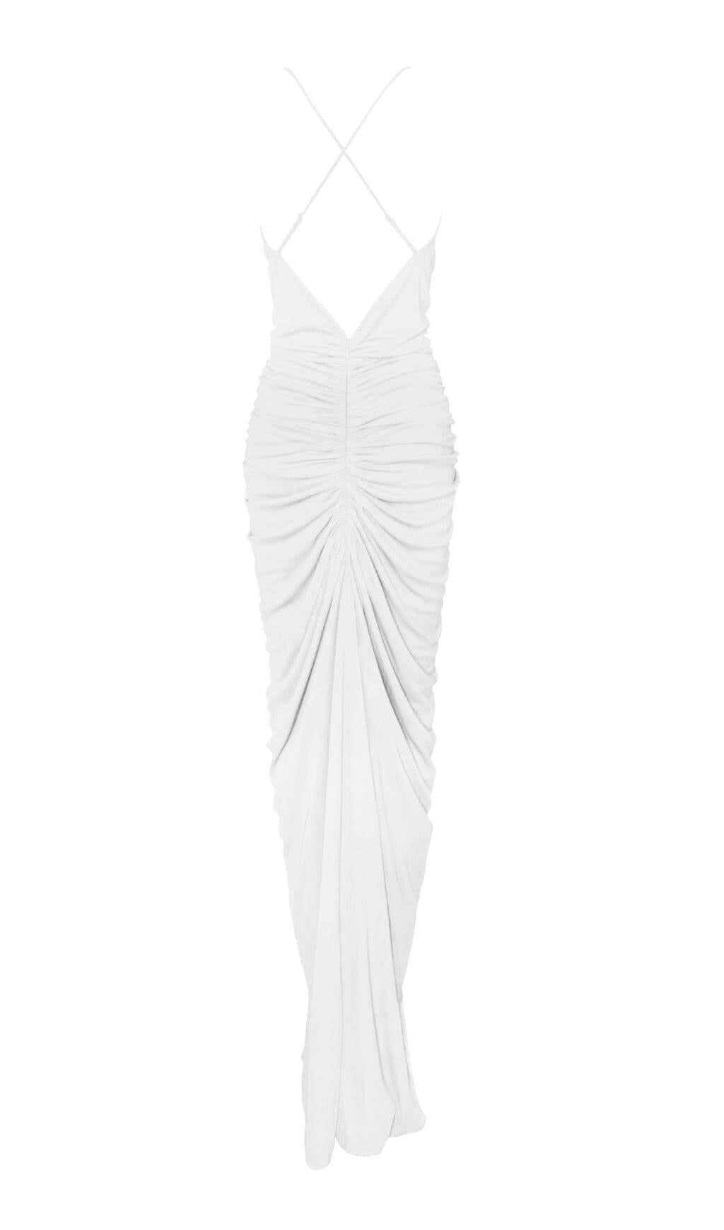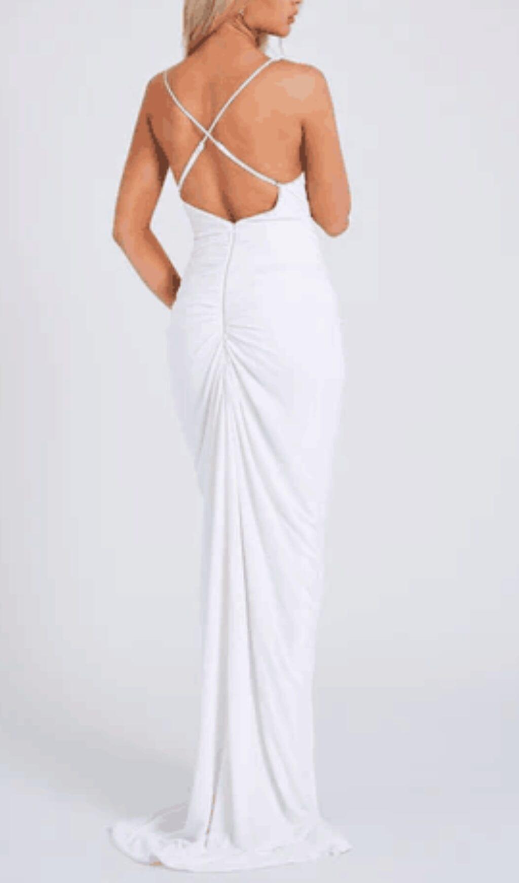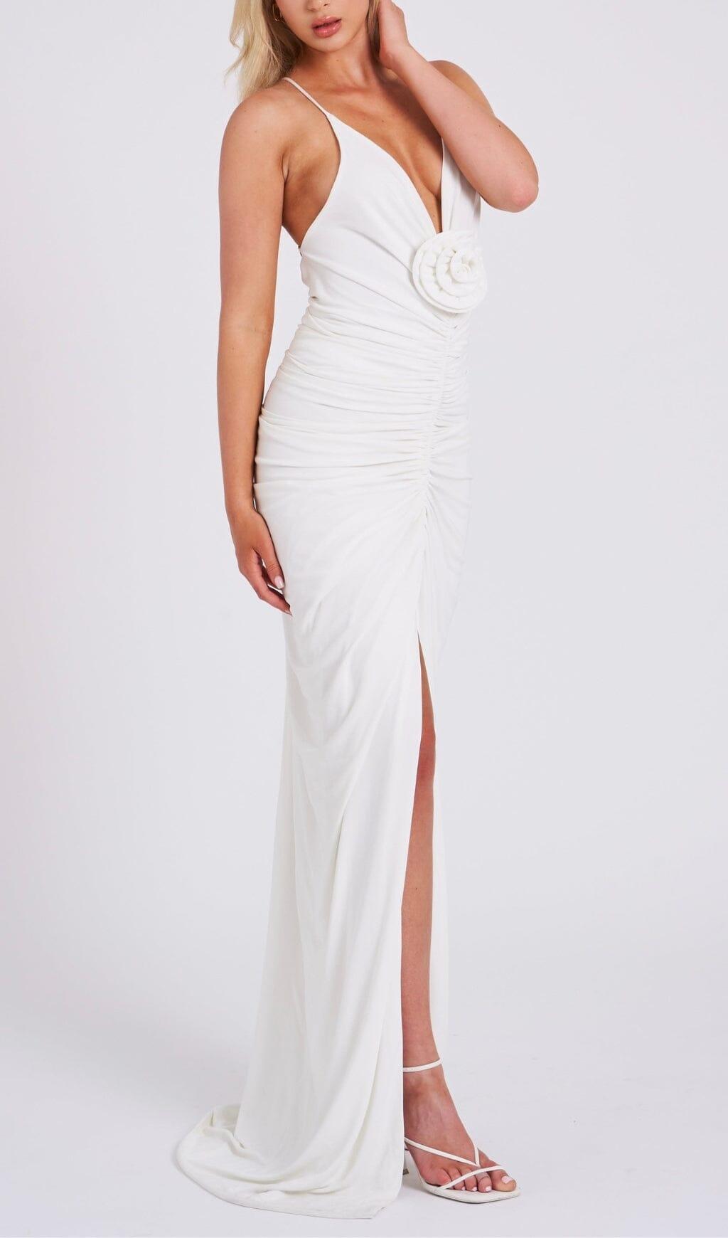 FLOWER-EMBELLISHED  PLUNGE MAXI DRESS IN WHITE