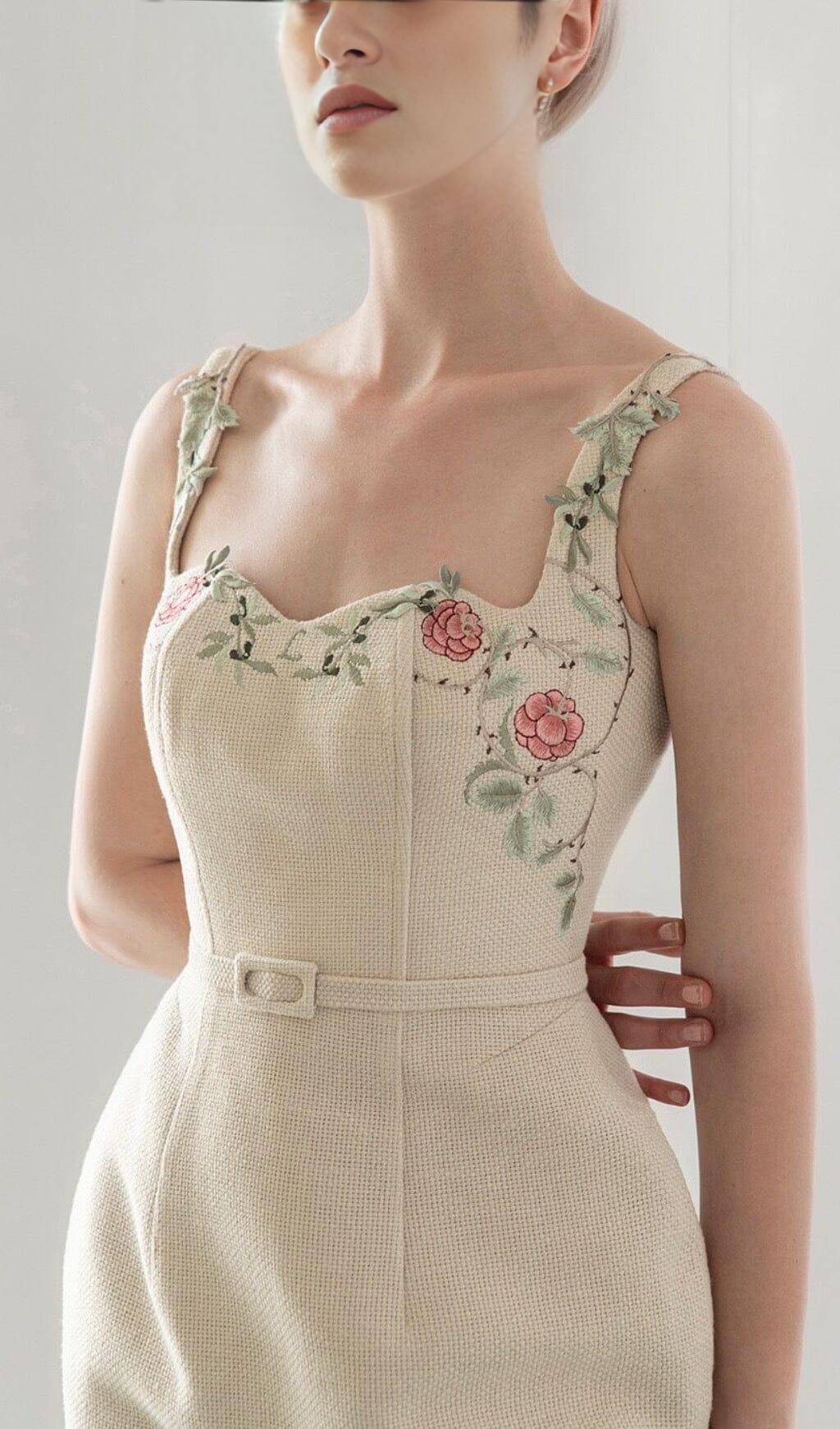 FLOWER EMBROIDERED LINEN SUSPENDER DRESS IN APRICOT