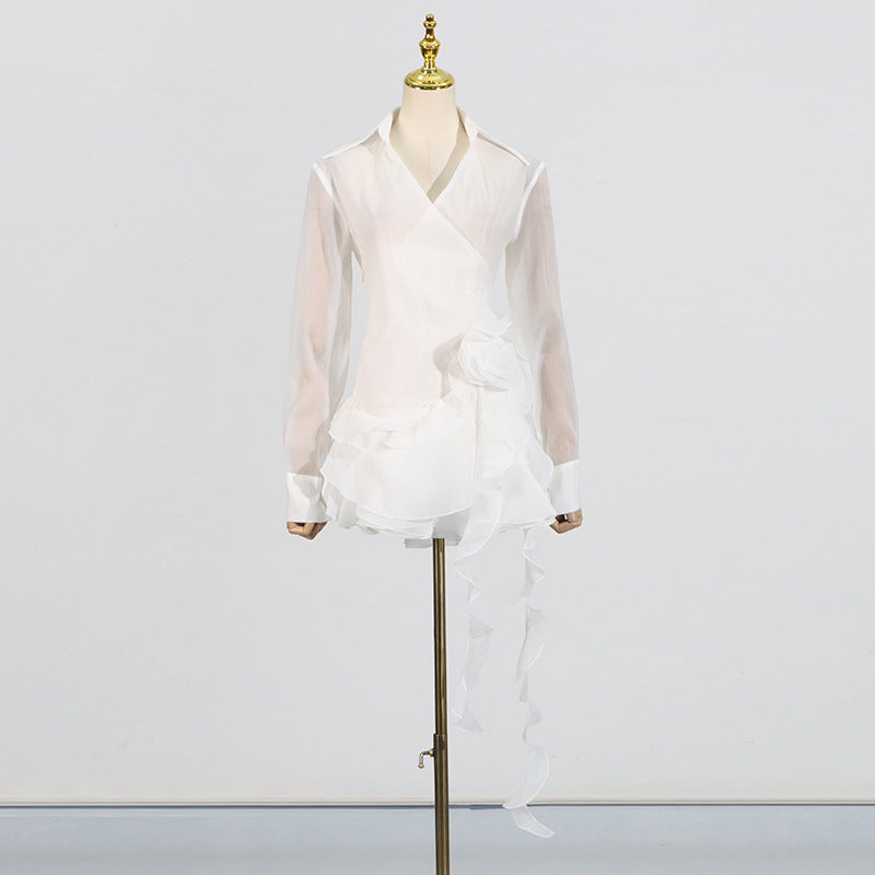 Enhance your wardrobe with our elegant flower ruffle ribbon mini dress in white. The delicate floral design and charming ruffle details will add a touch of femininity to any occasion. Made with high-quality materials, this dress is sure to be a staple in your closet.