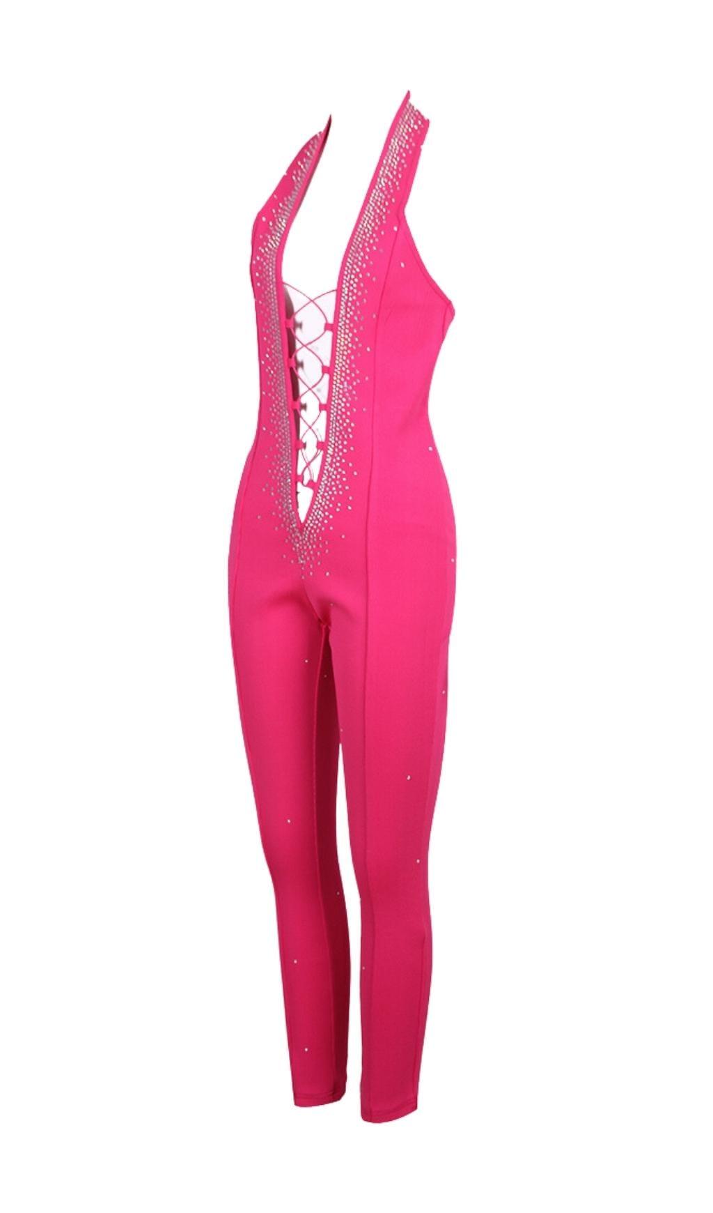 HALTER NECK CRYSTAL BACKLESS JUMPSUITS IN PINK