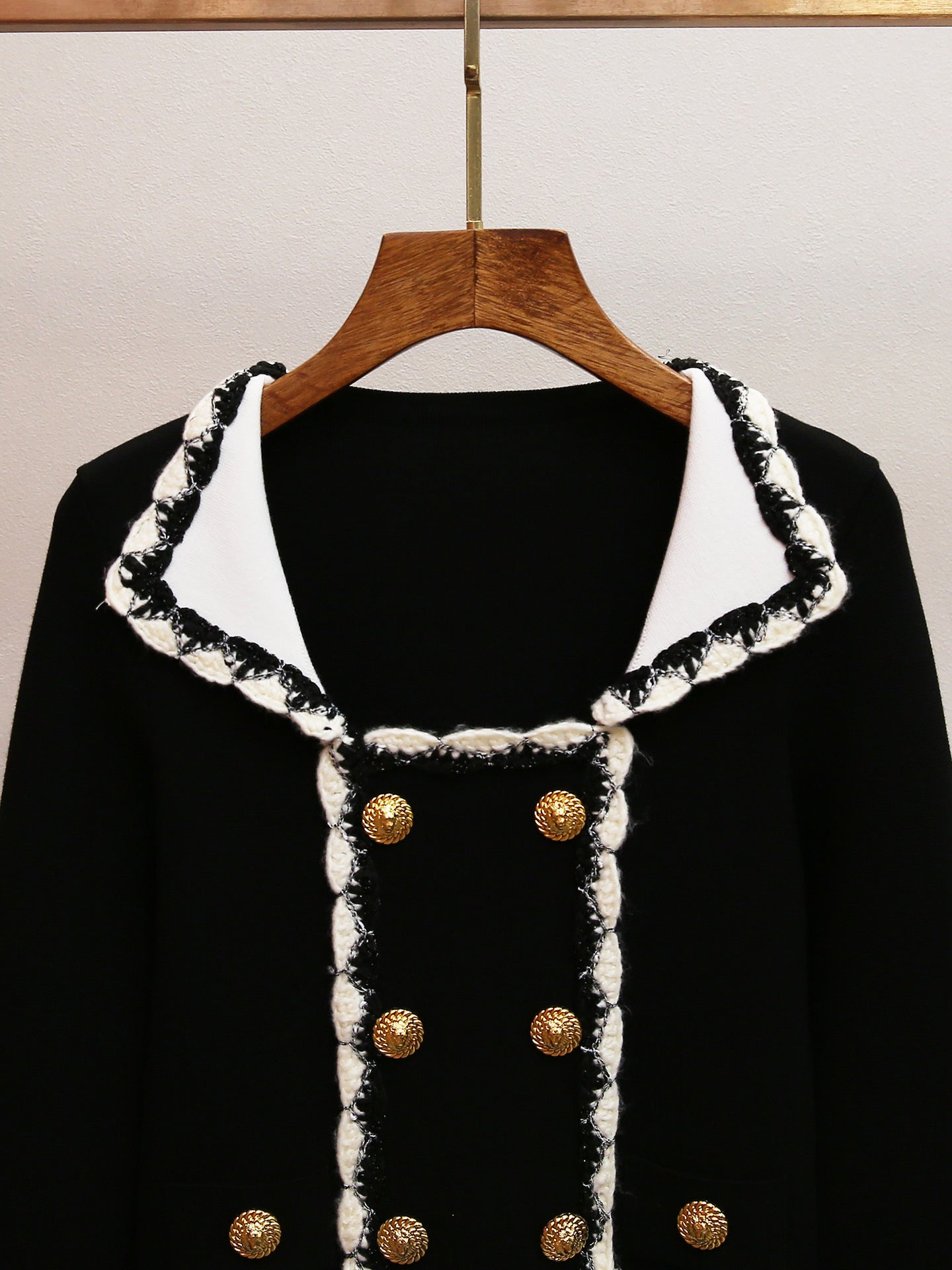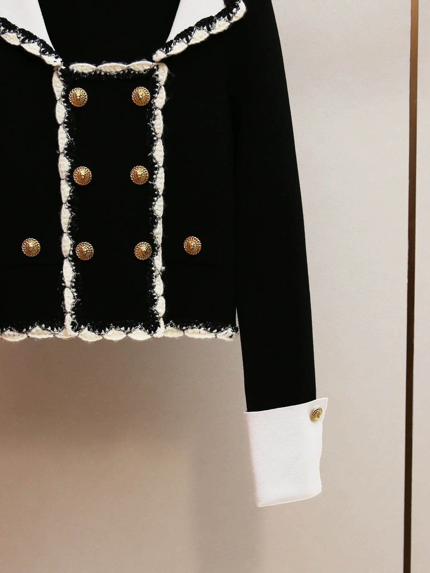 Inspired by iconic designs, this jacket features a striking double-breasted silhouette adorned with eight ornate, embossed gold buttons that truly catch the eye. The crisp white Peter Pan collar and matching wide cuffs provide a beautiful contrast against the deep black knit, exuding a refined charm. What sets the Harini jacket apart is its intricate white and black tweed-style fringe trim, meticulously outlining the collar, front placket, hem, and cuffs, adding a luxurious textured finish that speaks volumes about its quality and unique design.