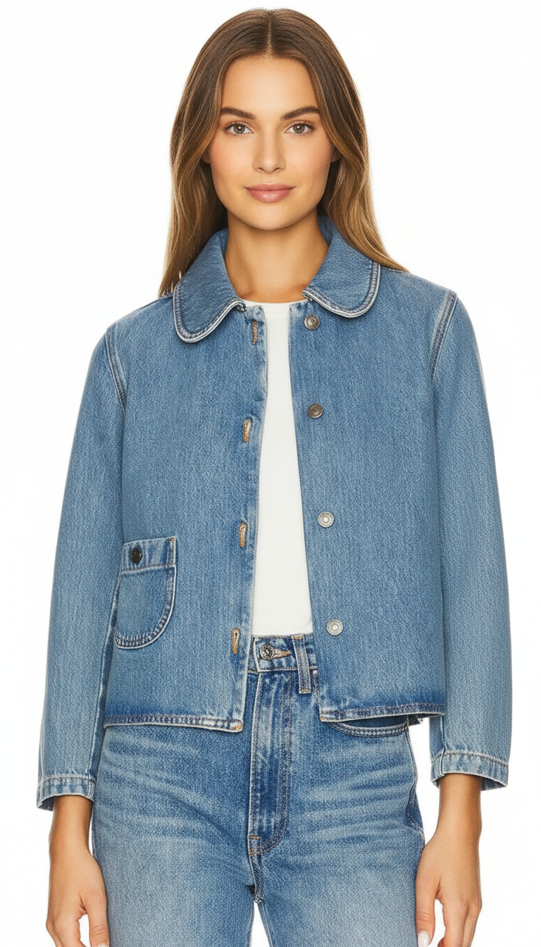Crafted from premium, comfortable denim, the Harmoni features a distinctive rounded Peter Pan collar and a chic cropped silhouette that perfectly complements any outfit. Its thoughtful design, complete with classic button-front closure and a stylish single patch pocket, offers endless styling possibilities.