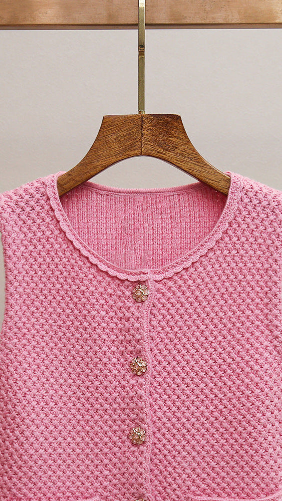 CHIC PINK KNIT VEST FOR WOMEN | ELEGANT SCALLOPED NECKLINE & GOLD BUTTON DETAILS