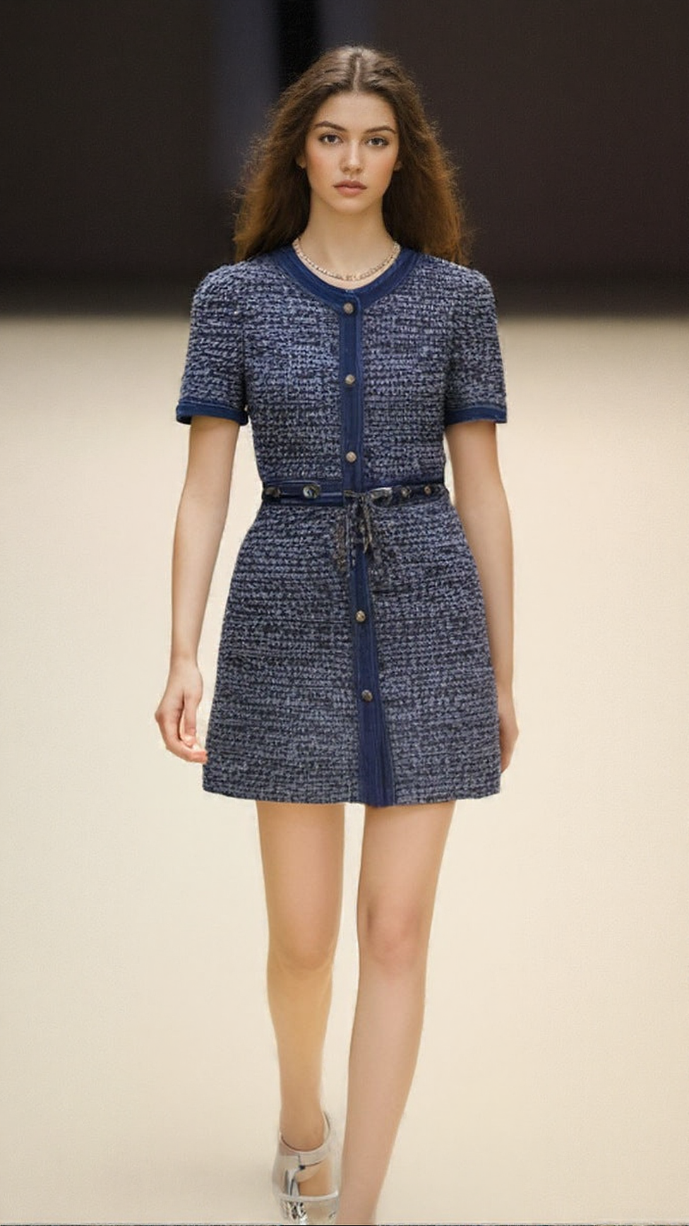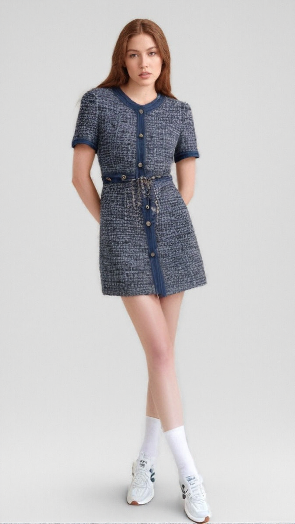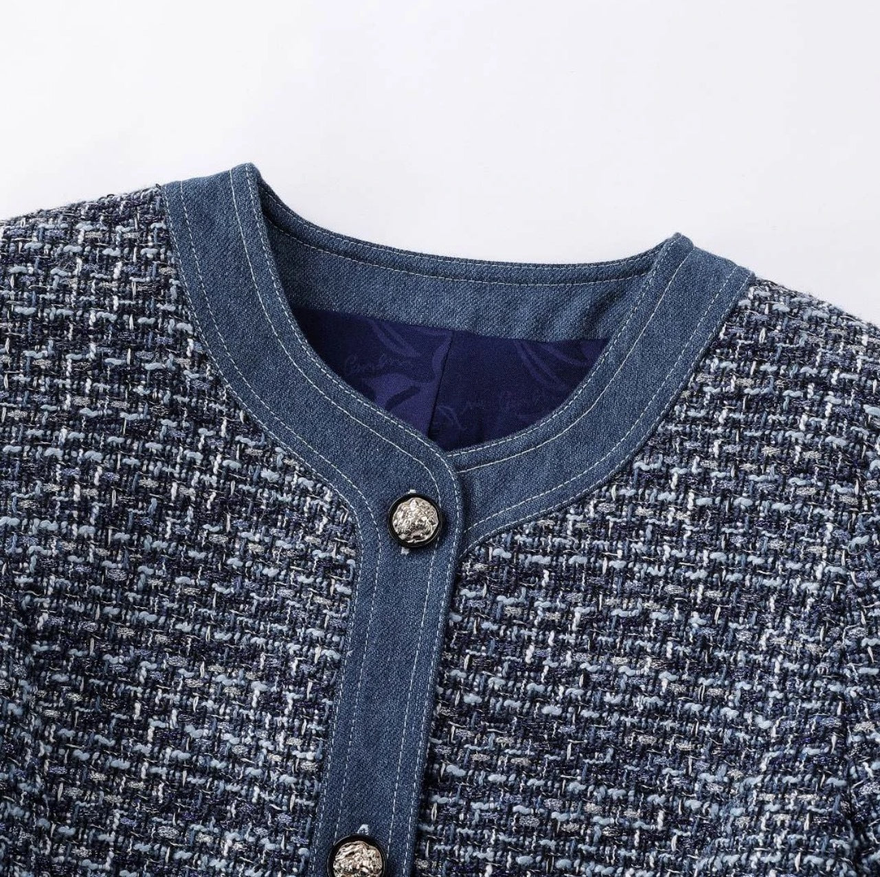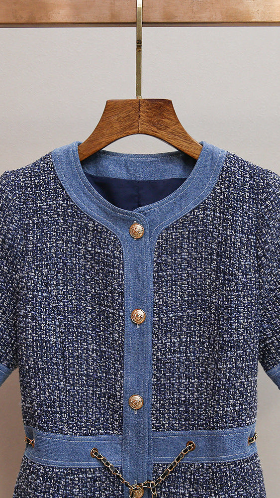 • Stylish Denim Accents: Effortlessly cool denim trims adorn the chic round neckline, structured front placket, short sleeve cuffs, and waistline, adding a contemporary, laid-back contrast to the classic tweed.