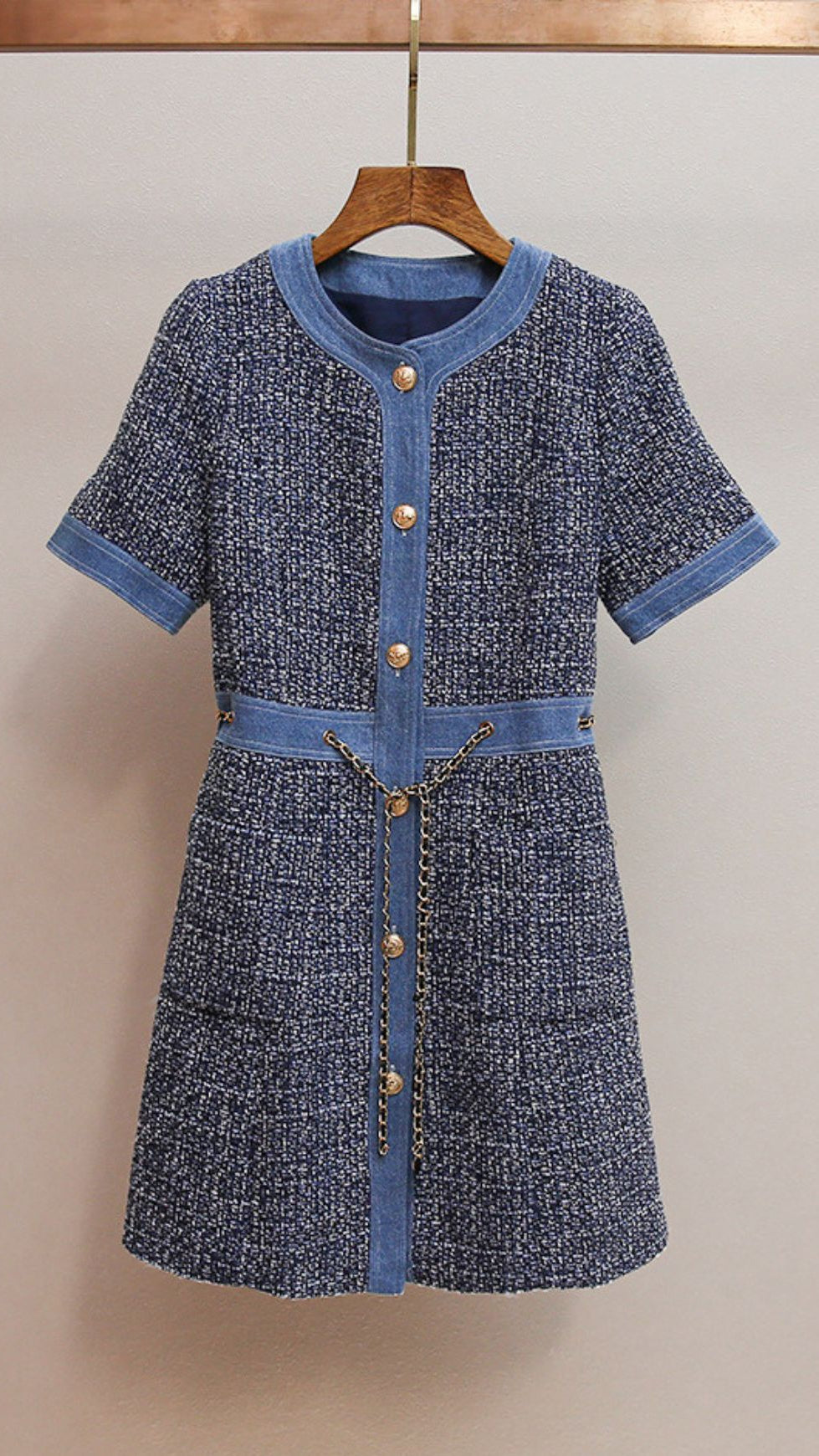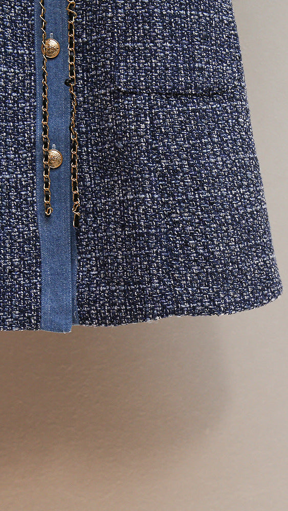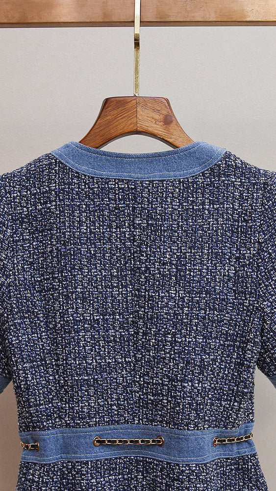 CHIC TWEED & DENIM MINI DRESS WITH GOLD CHAIN ACCENTS | HATSUYE