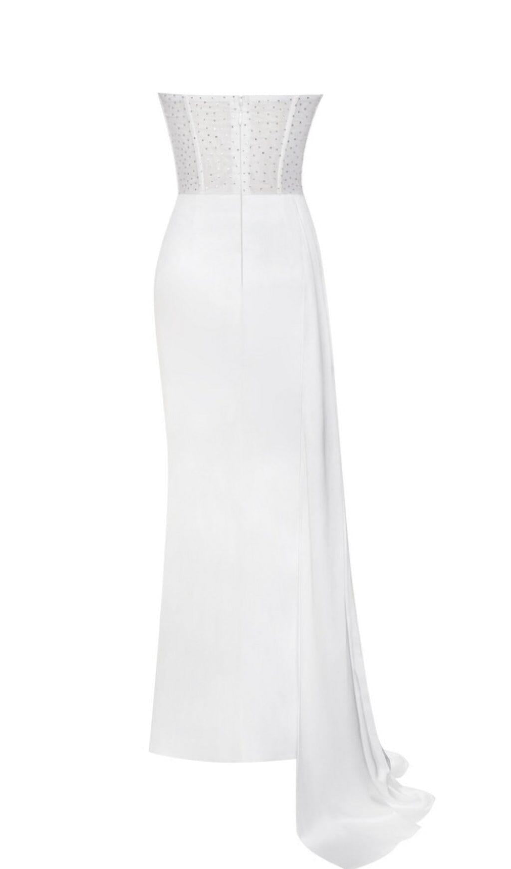 HOLLY WHITE CRYSTALLIZED CORSET HIGH SLIT SATIN GOWN