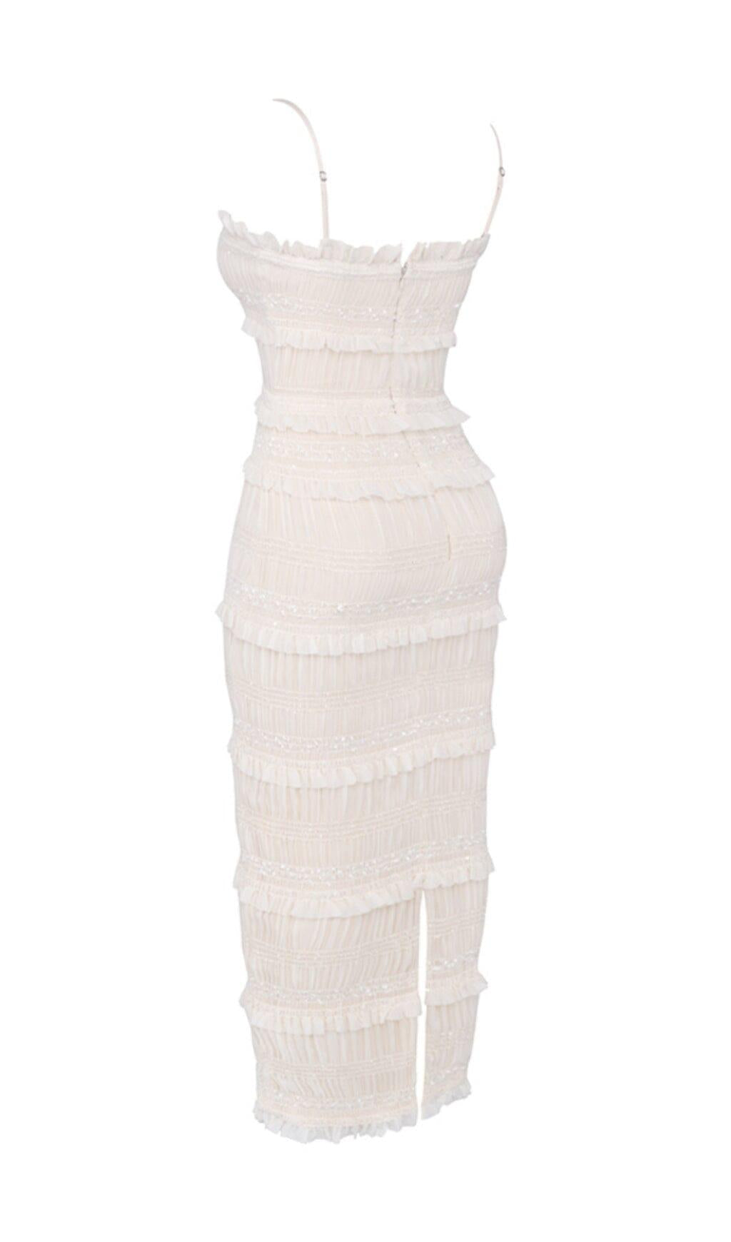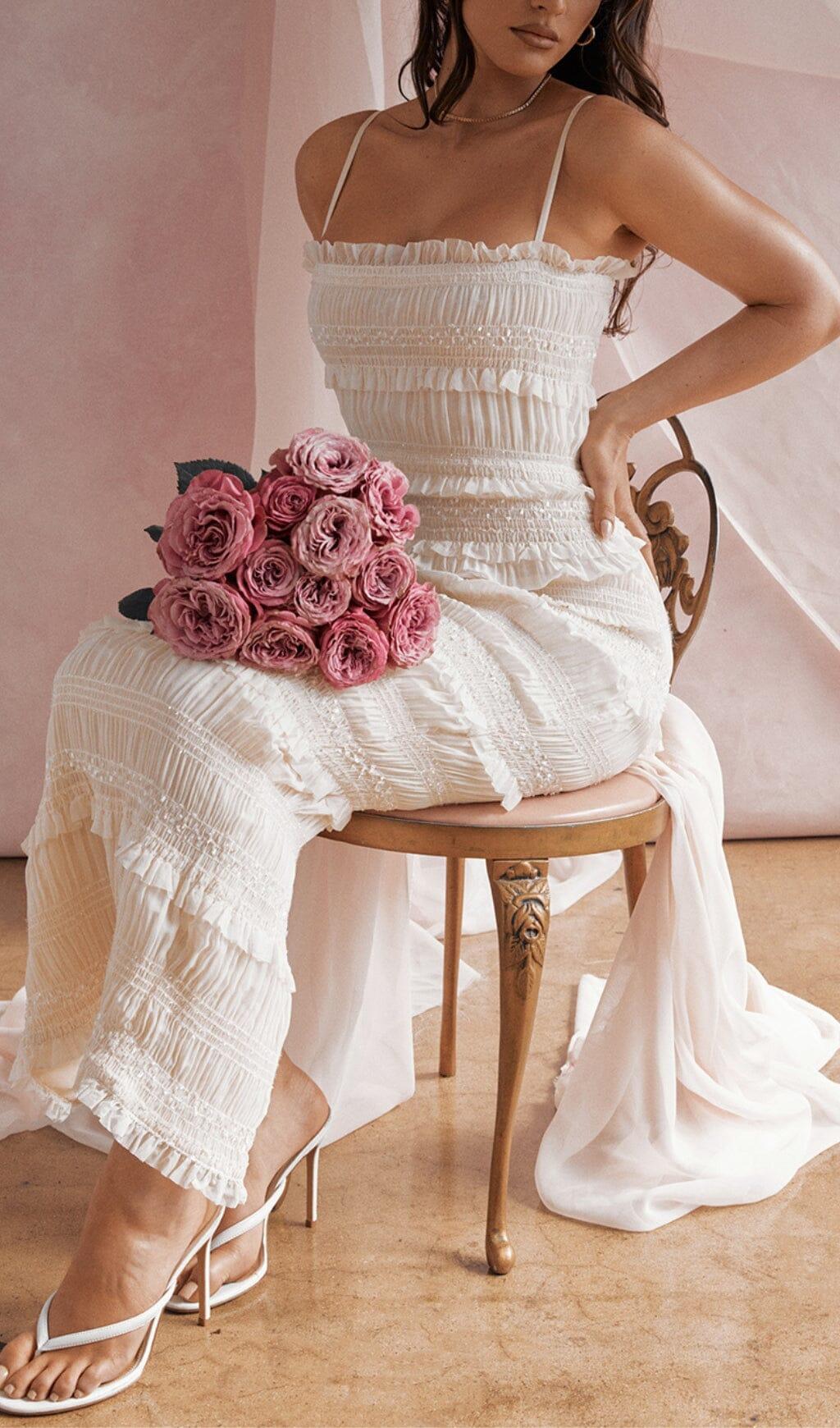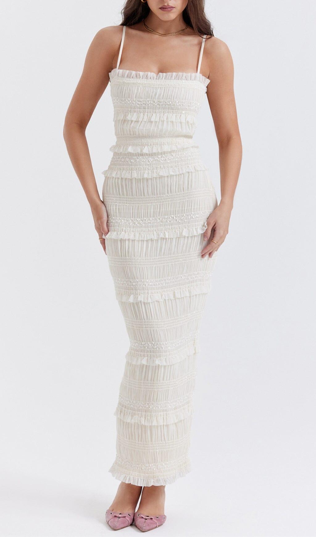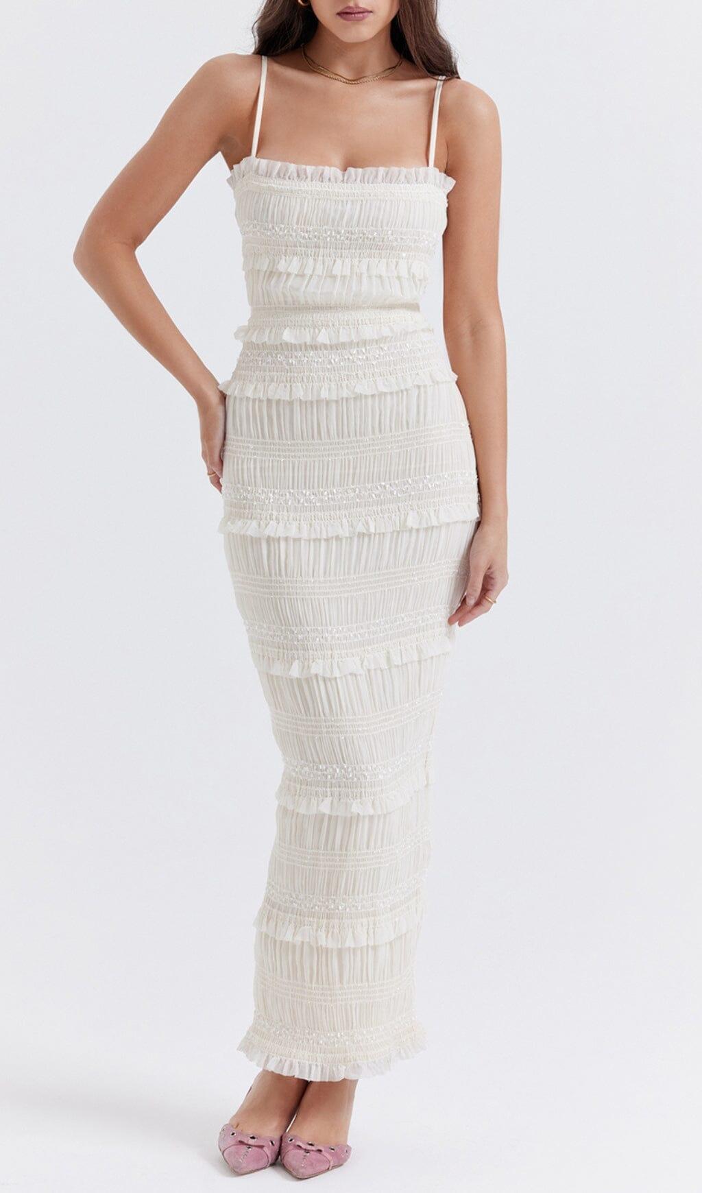 Whether you're attending a romantic date night, enjoying champagne with the girls, or attending a wedding or glam event, the IVORY SEQUIN PLEAT MAXI DRESS is the ideal choice. Its versatility makes it suitable for various occasions, and its exquisite design will surely make you stand out.