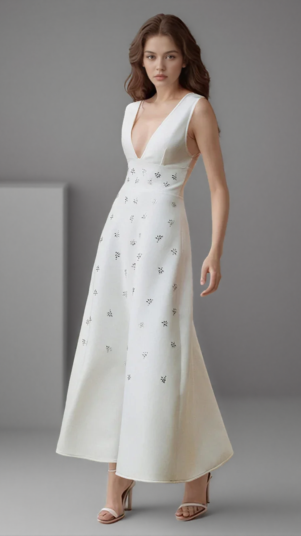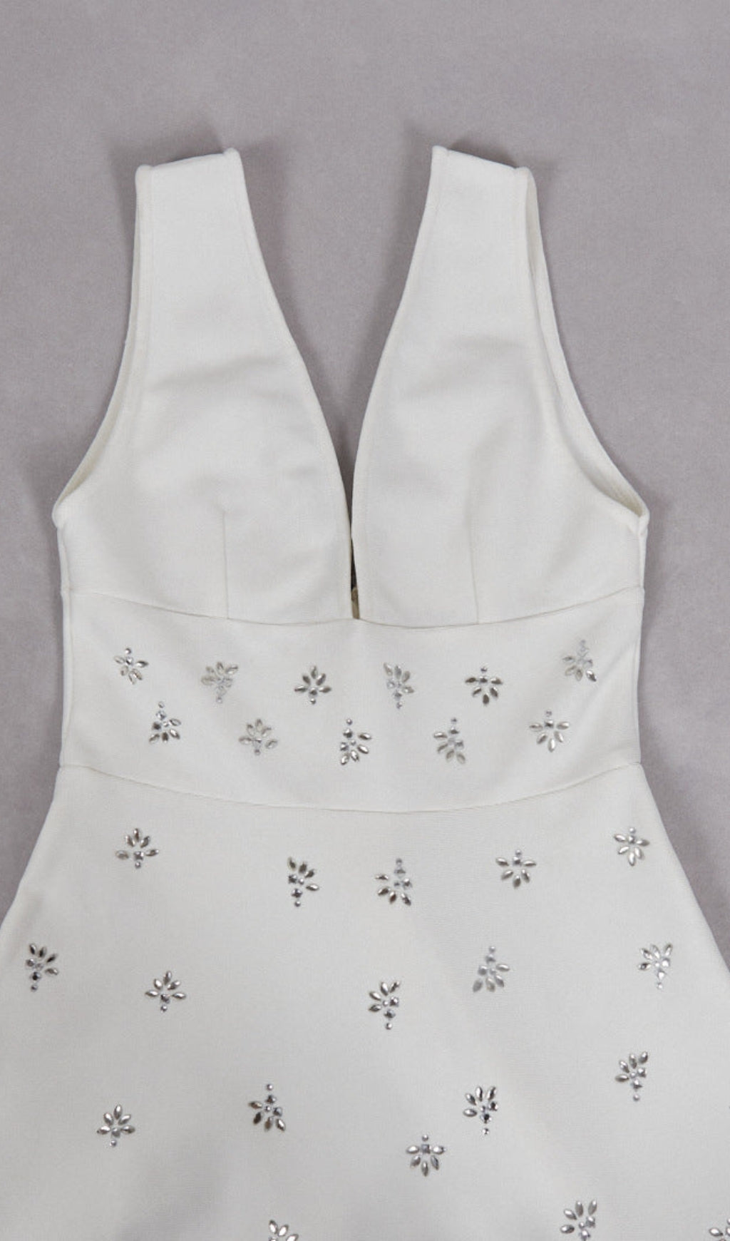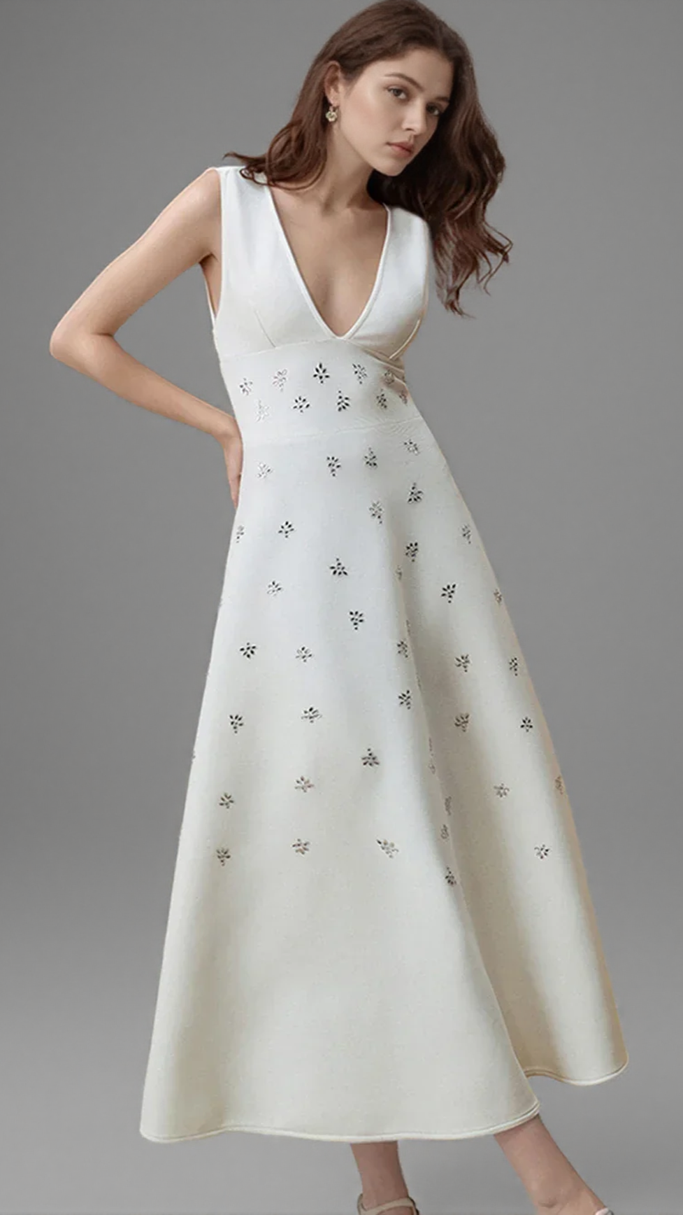 LILY DIAMOND V-NECK MIDI DRESS IN WHITE