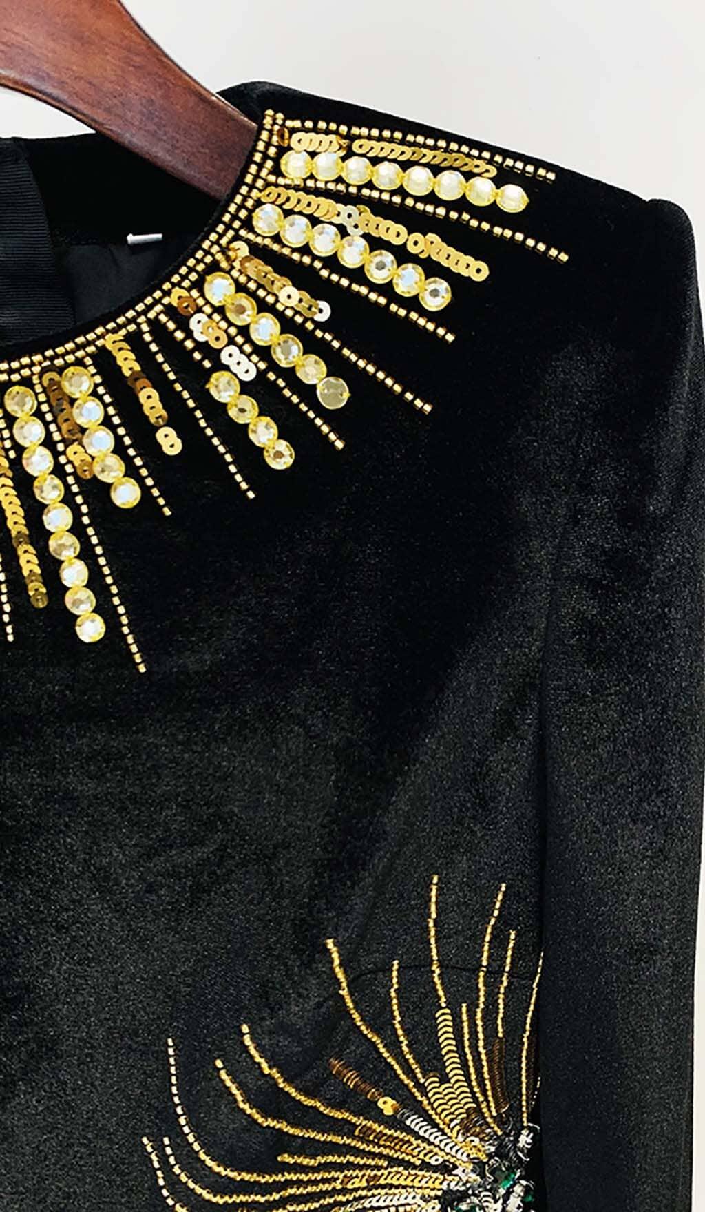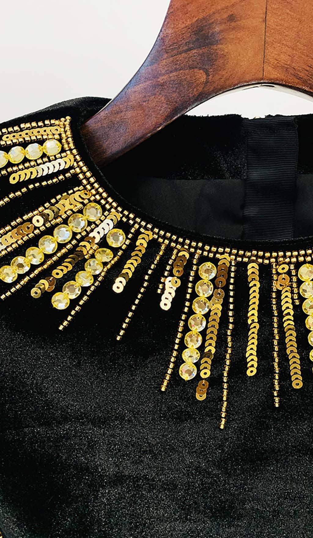 LONG-SLEEVE EMBELLISHED MINI DRESS IN BLACK