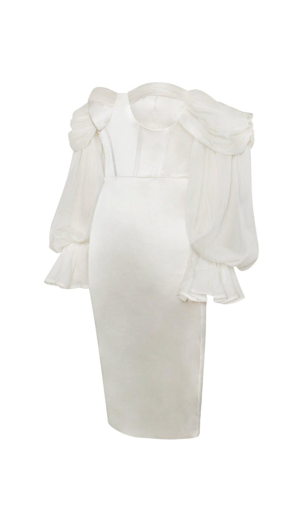 LYDIA PEARL WHITE SATIN OFF SHOULDER PUFF SLEEVE DRESS