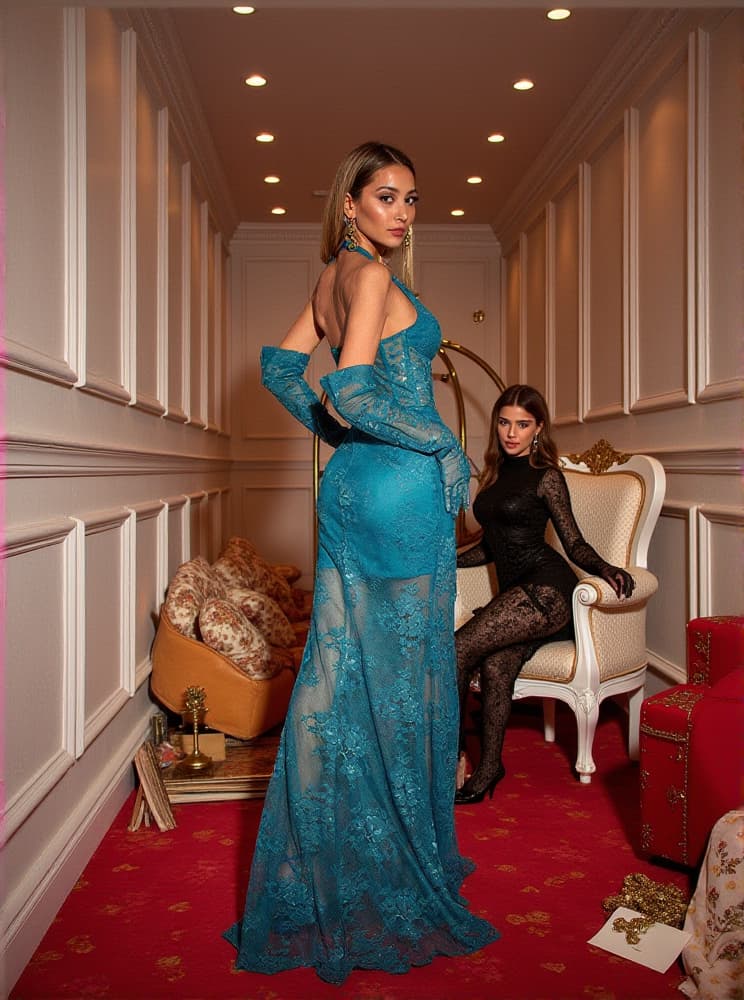 Malaz Halterneck Lace Maxi Dress With Gloves In Blue