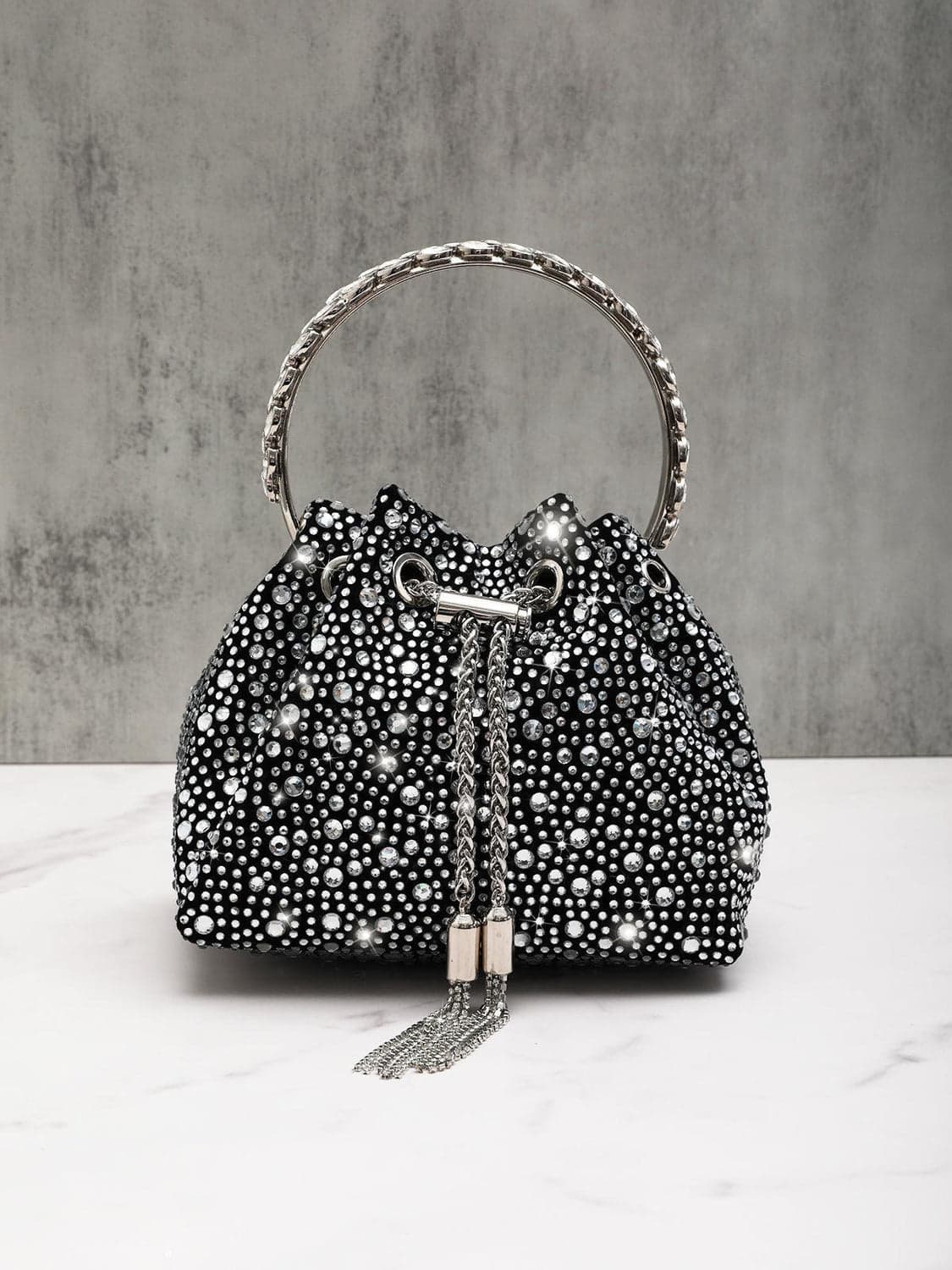 Our signature Mattea Crystal Embellished Bucket Bag In Black is crafted from crystal. A statement accessory to love forever, it is finished with a sparkling crystal top handle and a sleek drawstring chain that cinches the supple shape. Take yours with you everywhere.