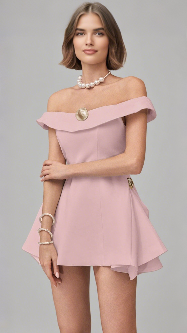 This pink off-shoulder mini dress features a flattering A-line silhouette enhanced by metallic detailing that adds subtle sophistication. Designed to highlight the shoulders with an elegant neckline, it offers a modern yet timeless look perfect for evening events or stylish daytime outings. The breathable fabric ensures comfort while maintaining structure, making it a versatile addition to any wardrobe seeking a refined statement piece.