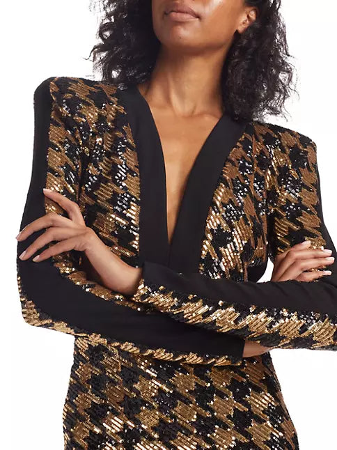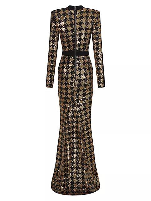 This show-stopping dress features a stunning metallic houndstooth pattern that will turn heads and make a statement. With its unique blend of classic and modern, this gown is perfect for any special occasion.
