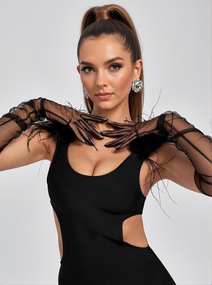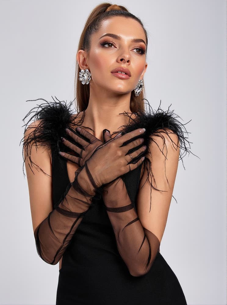 For those occasions when only elegance will do, our Nia Tulle Gloves In Black are ultra classy and a glamorous way to add the finishing touch. Cut from a soft stretch mesh that are gently gathered from the wrist and designed in an opera-length silhouette in a timeless black hue, 'Nia' are so comfortable to wear. Wear yours as our designers intended with our Emory Feather Cutout Bandage Mini Dress.