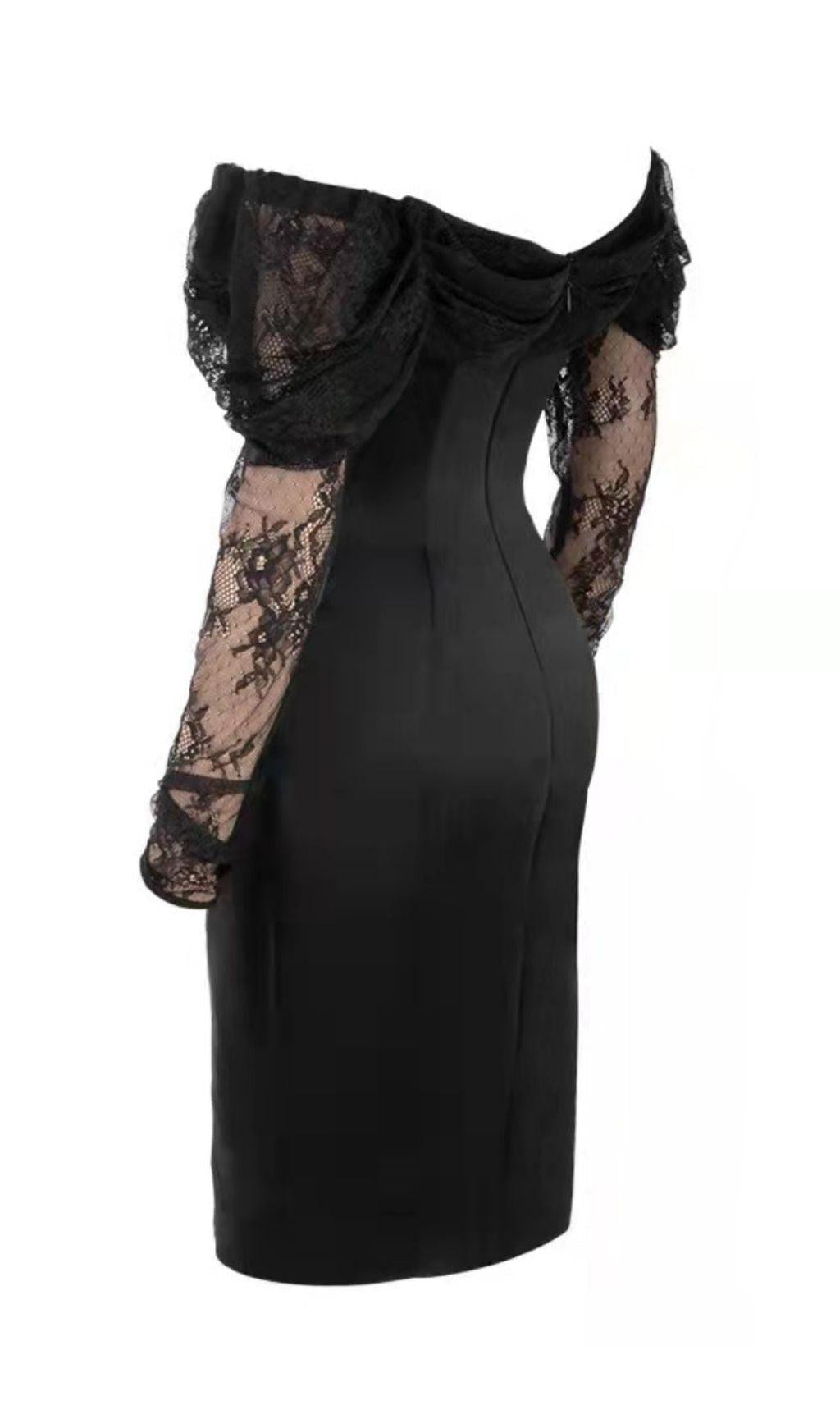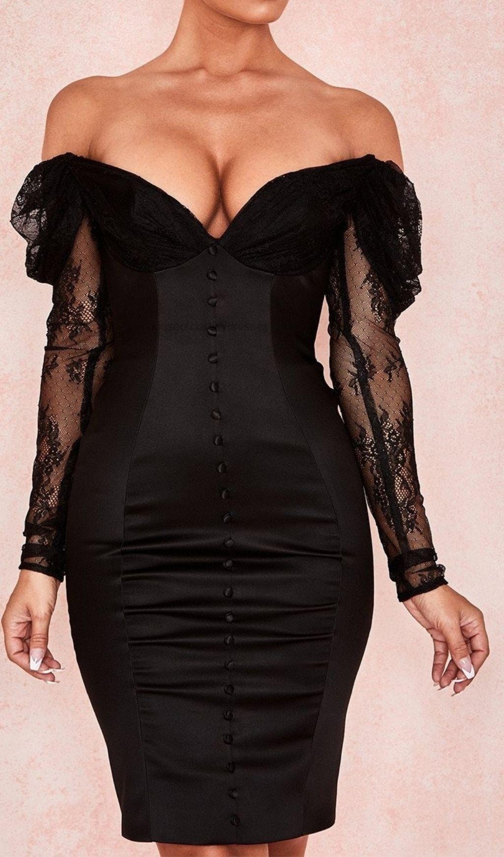 Introducing our fierce yet feminine Off Shoulder Corset Midi Dress in Black. Made from ultra-luxe stretch satin and delicate sheer lace, this dress is designed to make a statement. What sets it apart from the rest is its built-in corset that is properly boned down to the waist, giving you a stunning hourglass figure.