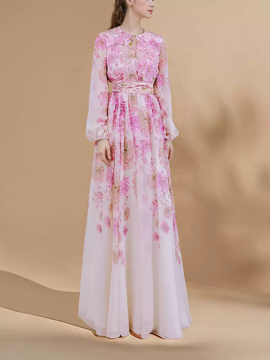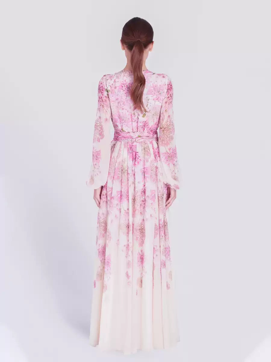 Pink Floral Chiffon Maxi Dress with Sheer Sleeves
