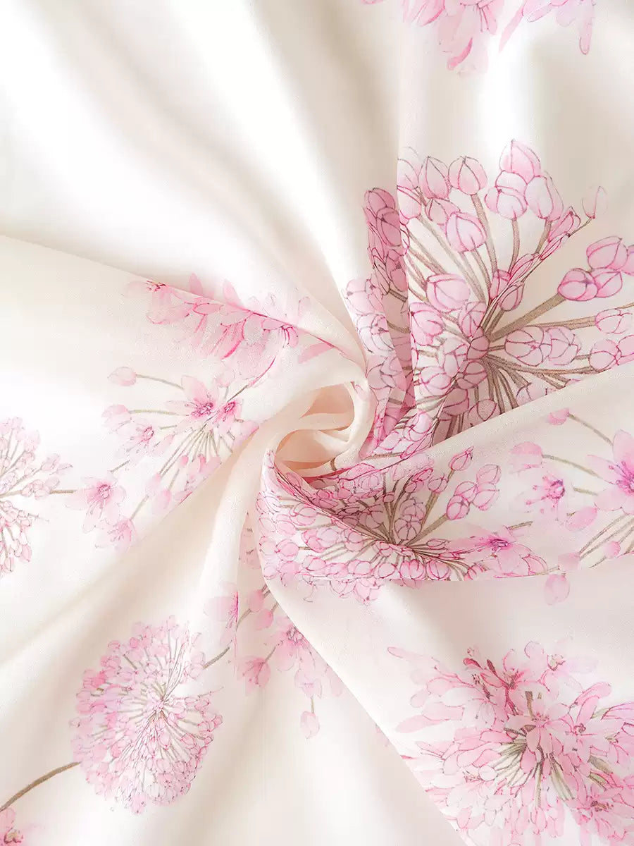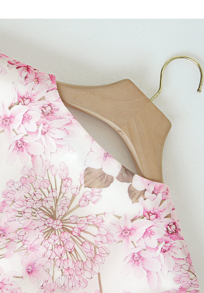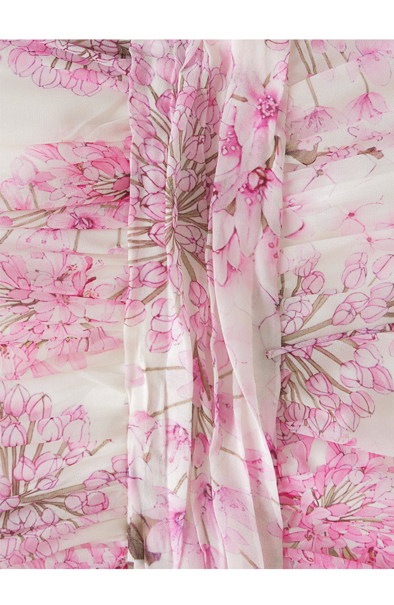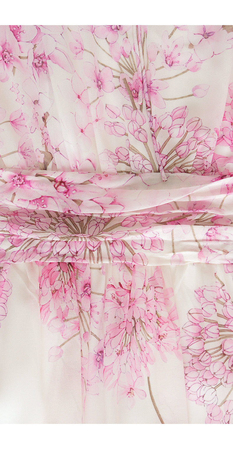 This dress features a soft pink hue adorned with delicate floral patterns. Sheer sleeves add an elegant, airy touch, while the cinched waist and flowing maxi skirt create a graceful silhouette. Ideal for special occasions like summer weddings, garden parties, or homecoming events. It combines bohemian charm with a sophisticated design, making you look stylish and ethereal.