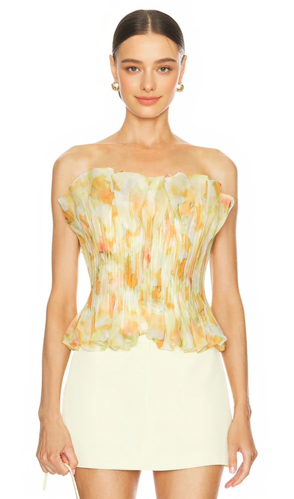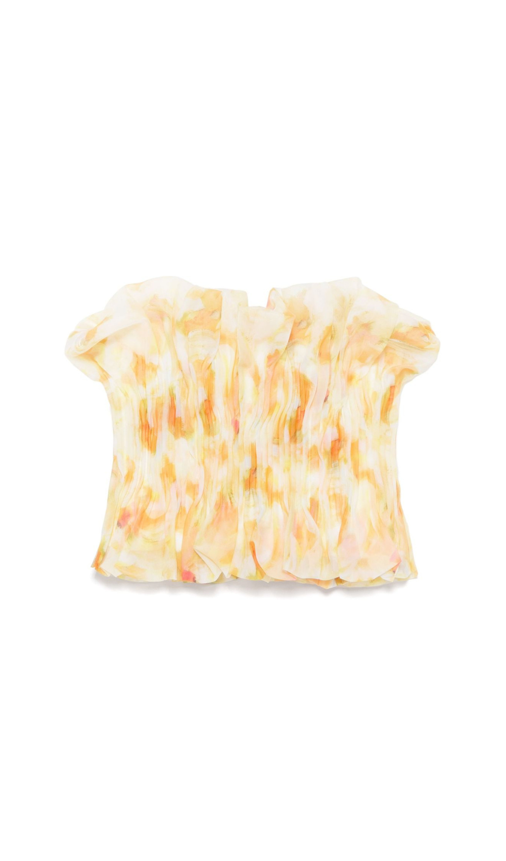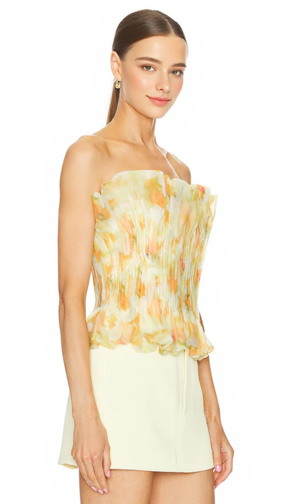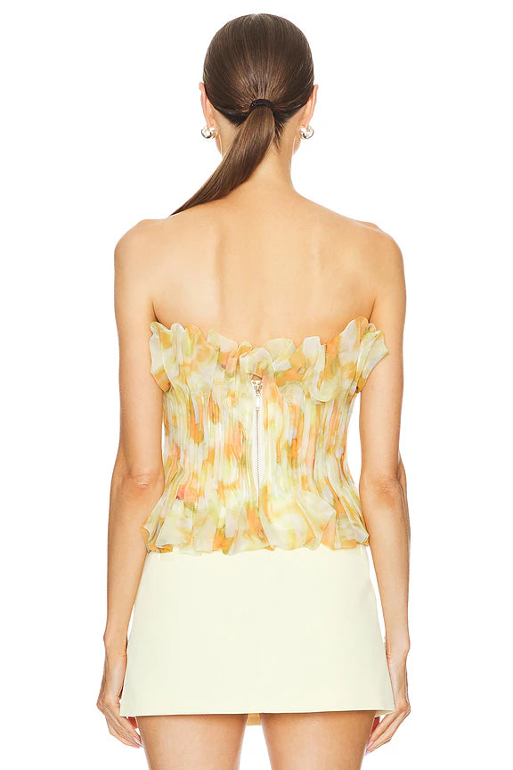 print ruffle trim top in yellow