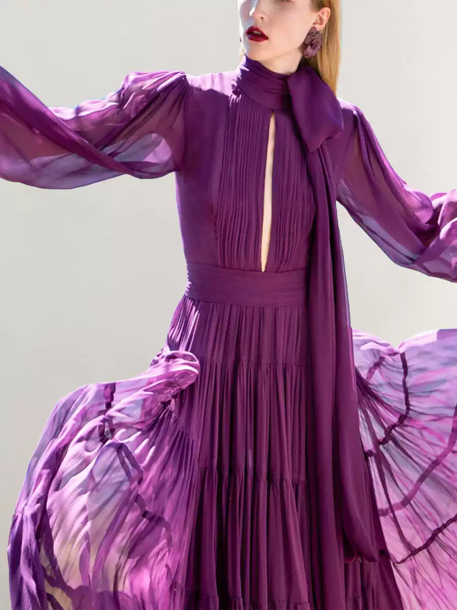 This luxury satin maxi dress in vibrant purple exudes elegance. The slim - fit design flatters the figure, while the gathered detailing on the bodice and puff sleeves add a touch of sophistication. Crafted from high - quality satin, it has a smooth and glossy texture, perfect for those wanting to dress to impress, just like the charm associated with an Ariana Grande - inspired glamorous look.