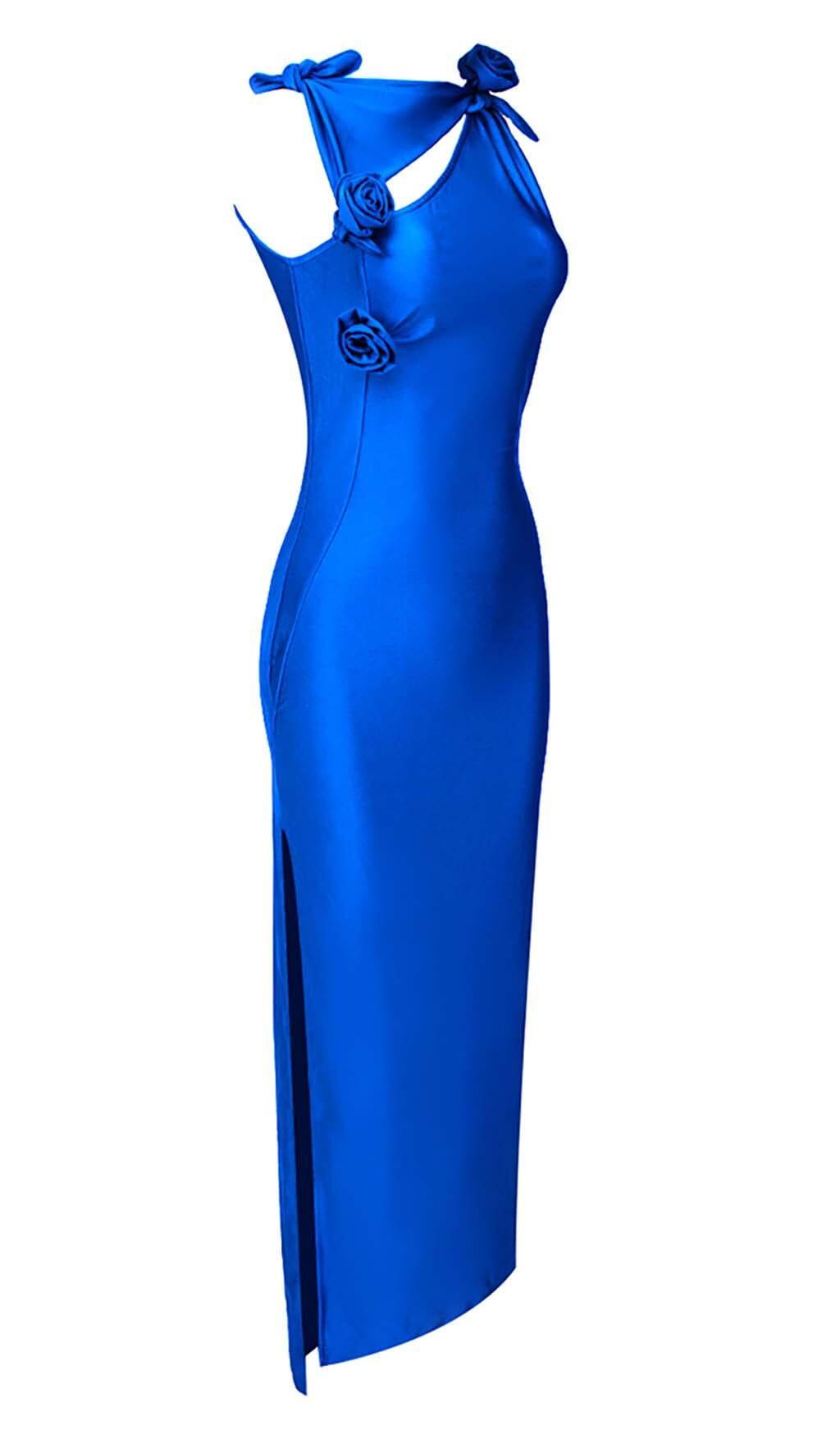 ROSE-EMBELLISHED SATIN MIDI DRESS IN BLUE