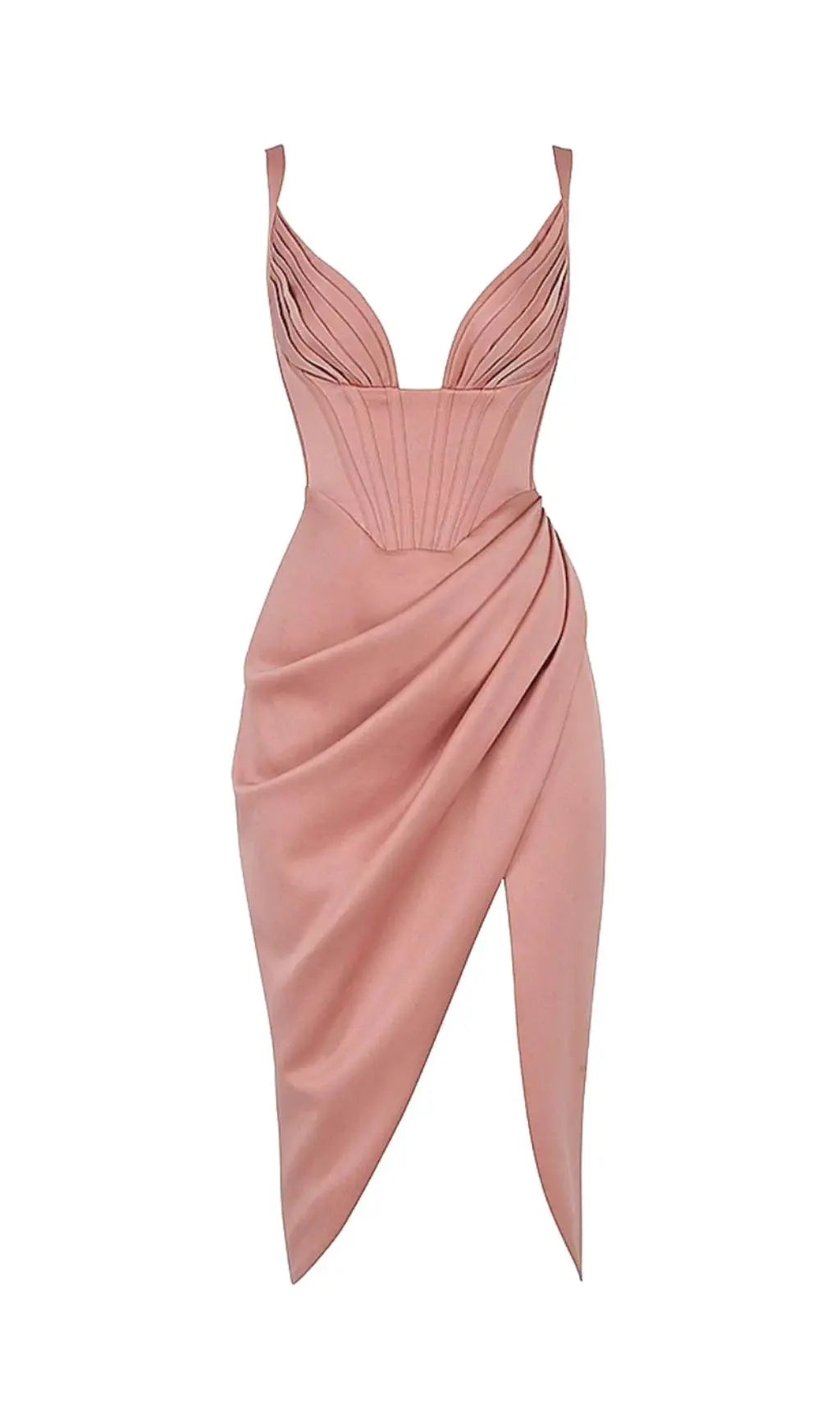 Our dress is equally feminine and flattering with a touch of elegance. Made from our ultra luxe duchess satin in a beautiful rose hue, It has a plunging neckline with pretty petal shape pleated cups, framed by slim straps. The bodice has our special corsetry boning to ensure the utmost support and gives the bust a volumising lift for the ultimate cleavage. The internal layer is lined in a stretch woven fabric for a non slip hold.