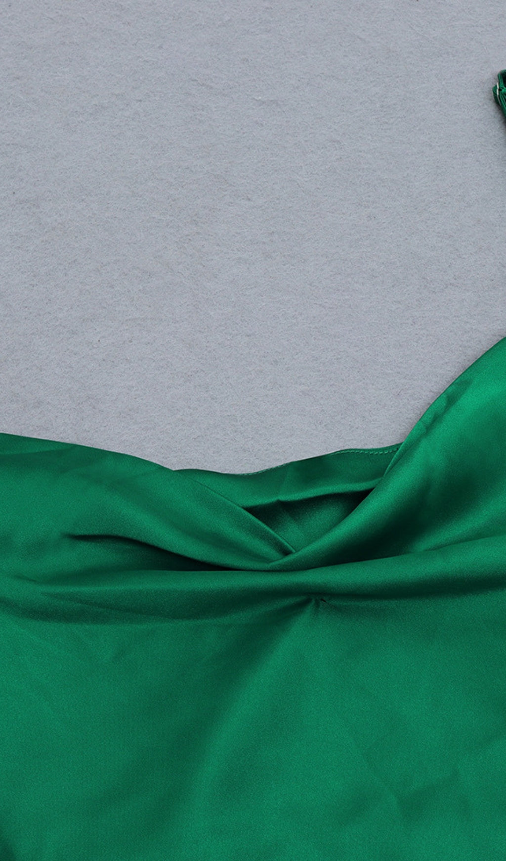Satin Cowl Neck Asymmetric Midi Dress in Green