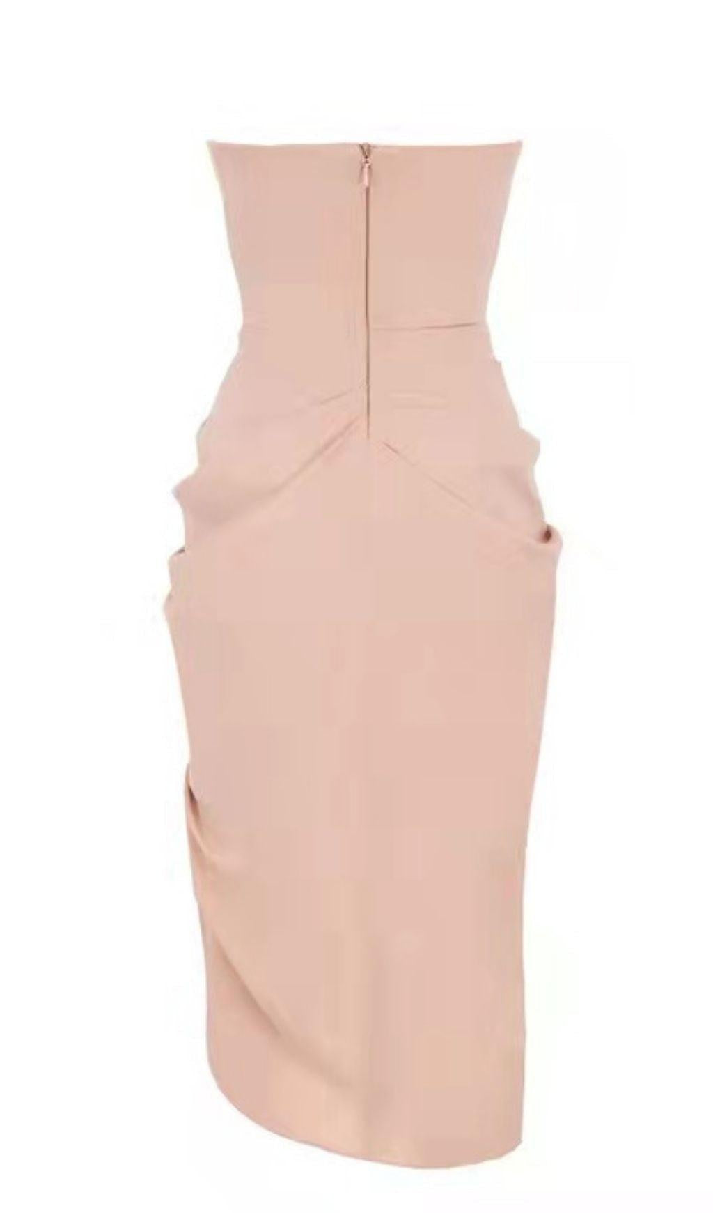 Introducing the Silk Strapless Ruched Midi Dress in Pink