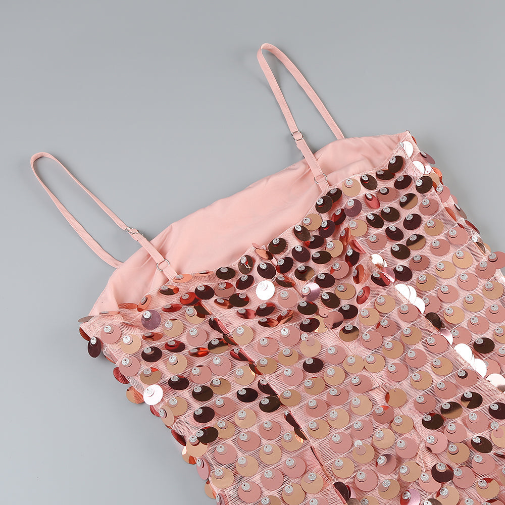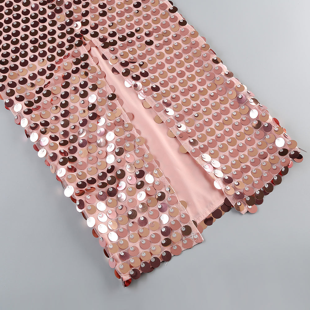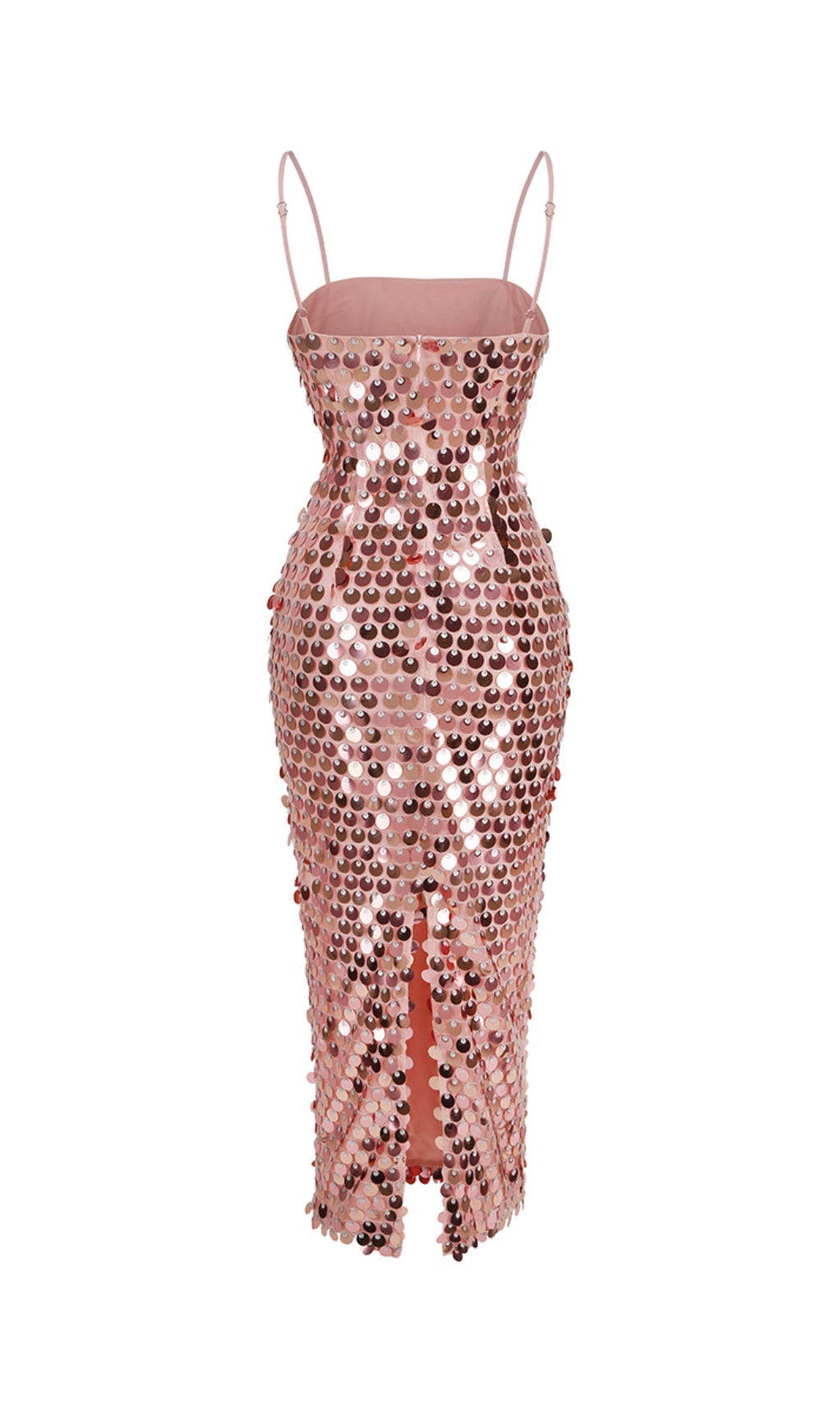 This stunning dress features an all-over sequin design and flattering midi length. With adjustable straps, it's perfect for all body types. Stand out at your next event with this sparkly and versatile dress.