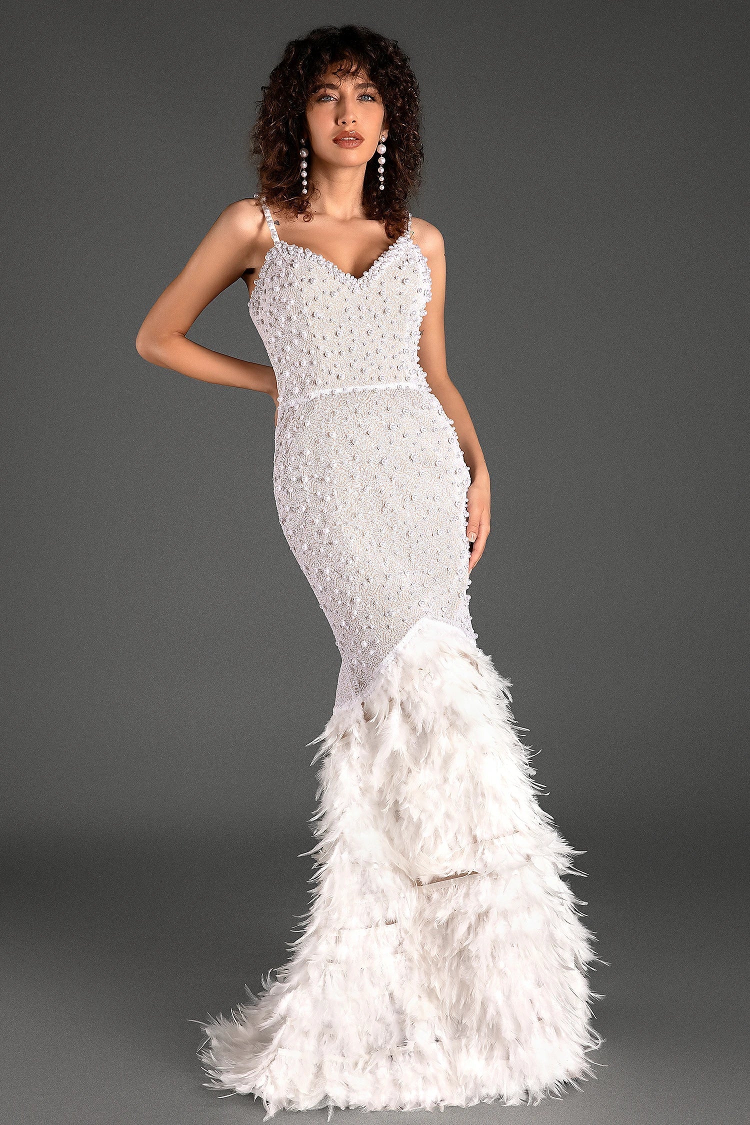 The slender straps of the Totaki Strap Pearl Feather Dress add a touch of refinement that balances elegance and comfort. This design ensures a secure fit while accentuating your shoulders and neckline.