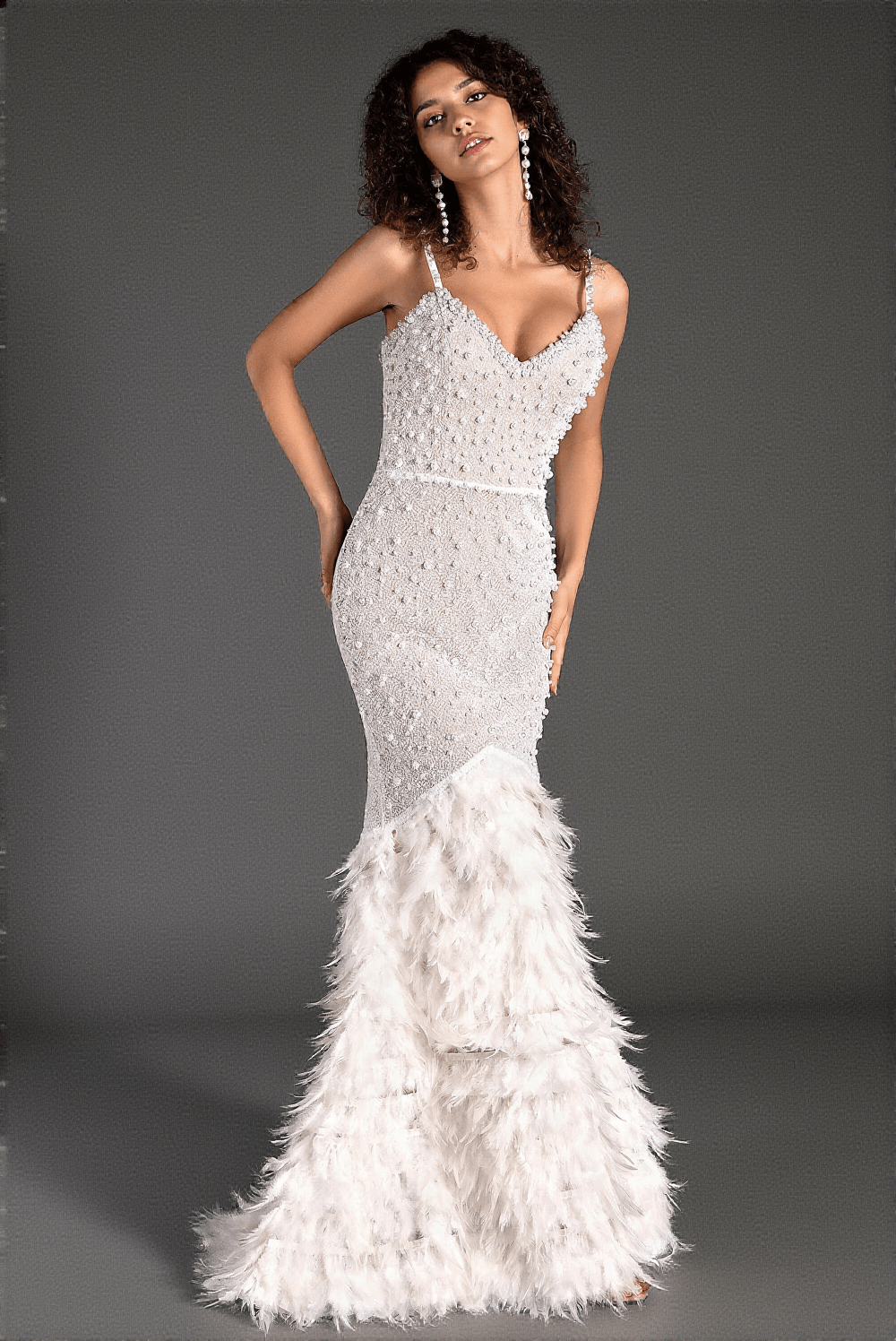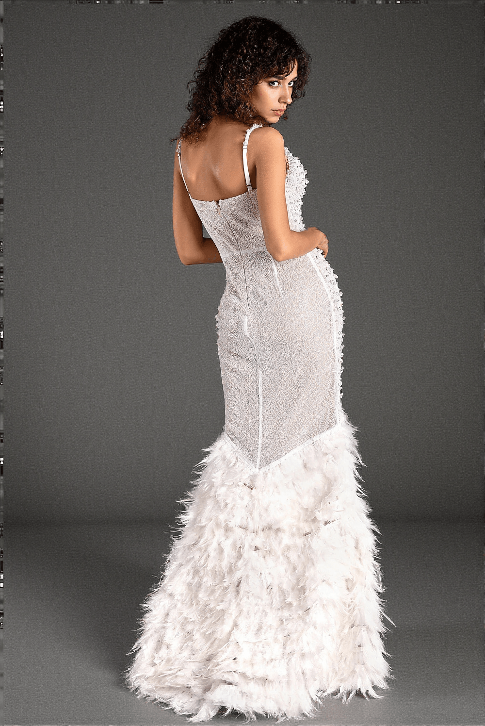 • Featuring a stunning feather accent at the hem, this dress provides a dramatic and eye-catching silhouette.
