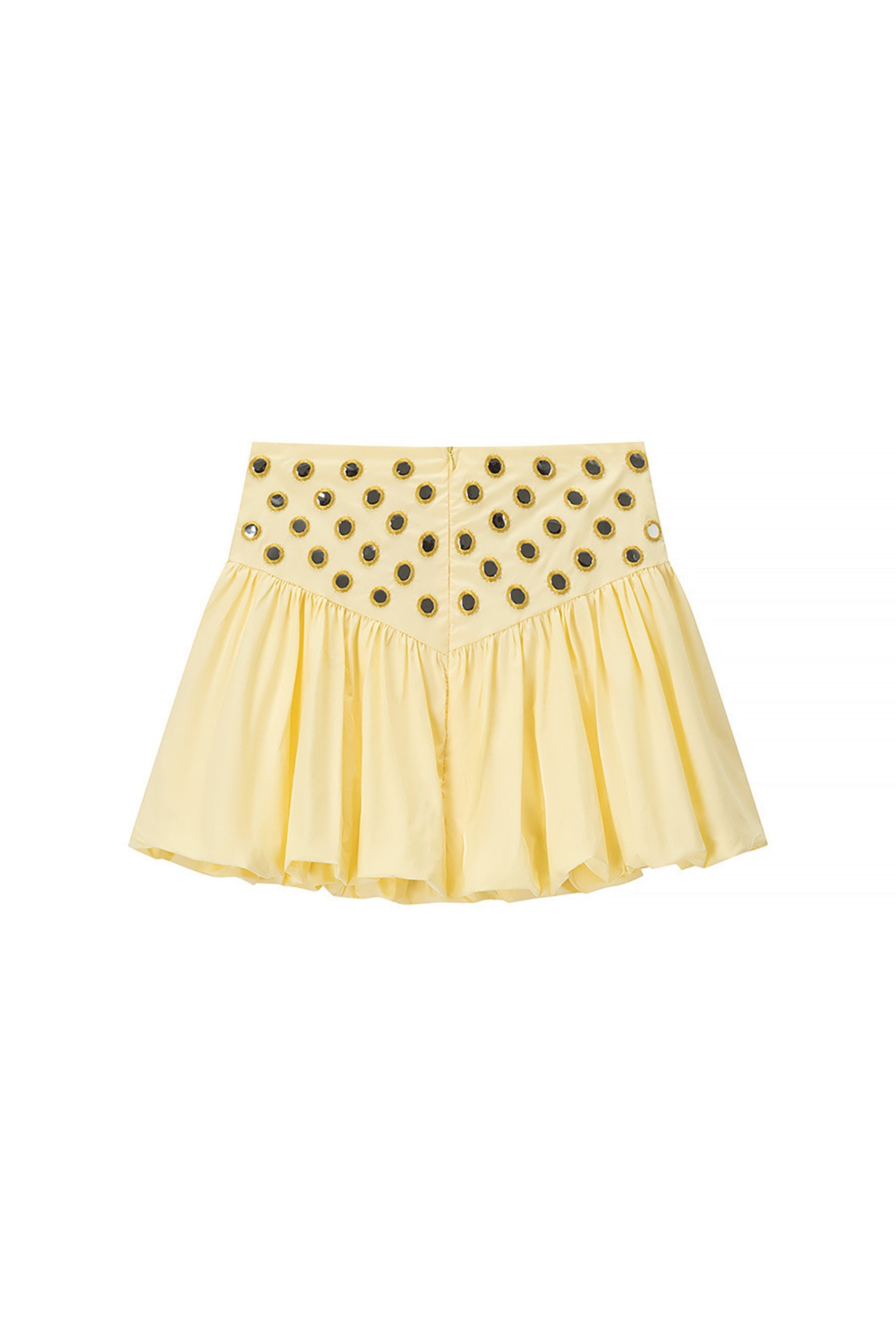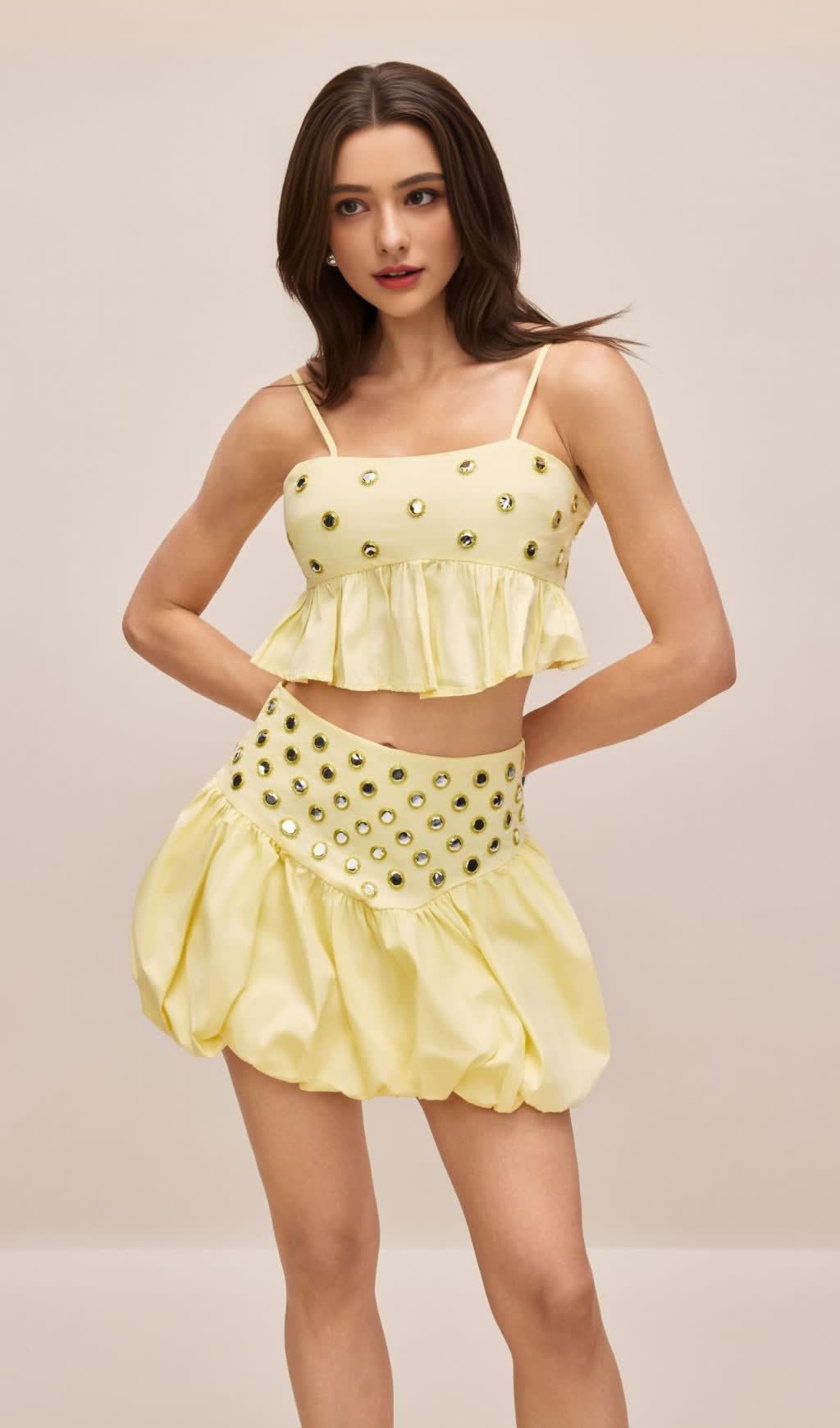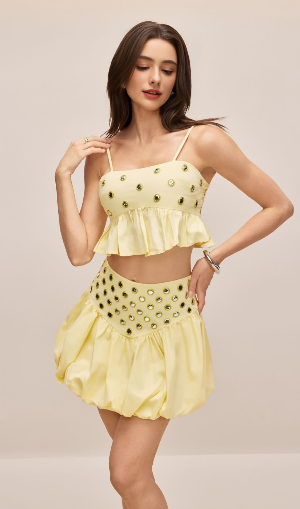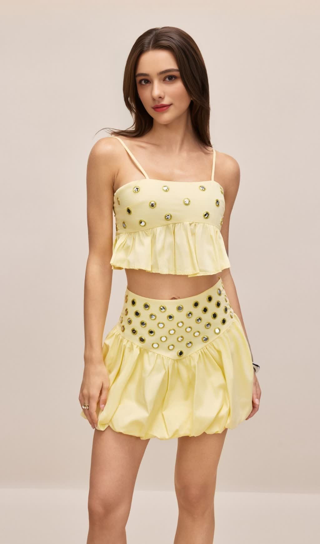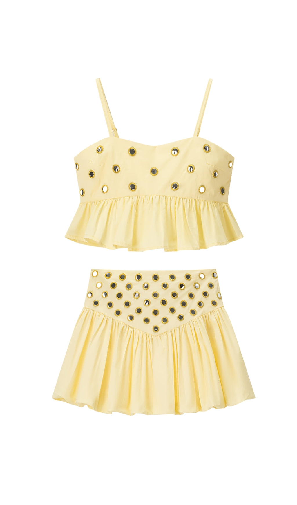 Spaghetti Straps, Ruffle Hem Top, Mirror Embellishments, High Waist Bubble Skirt.