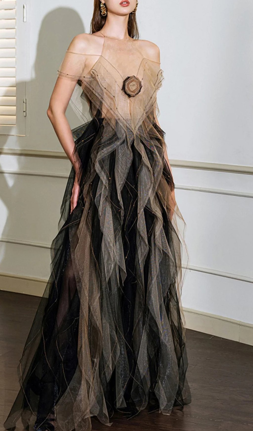 valerie floral ruffled tulle maxi dress in black